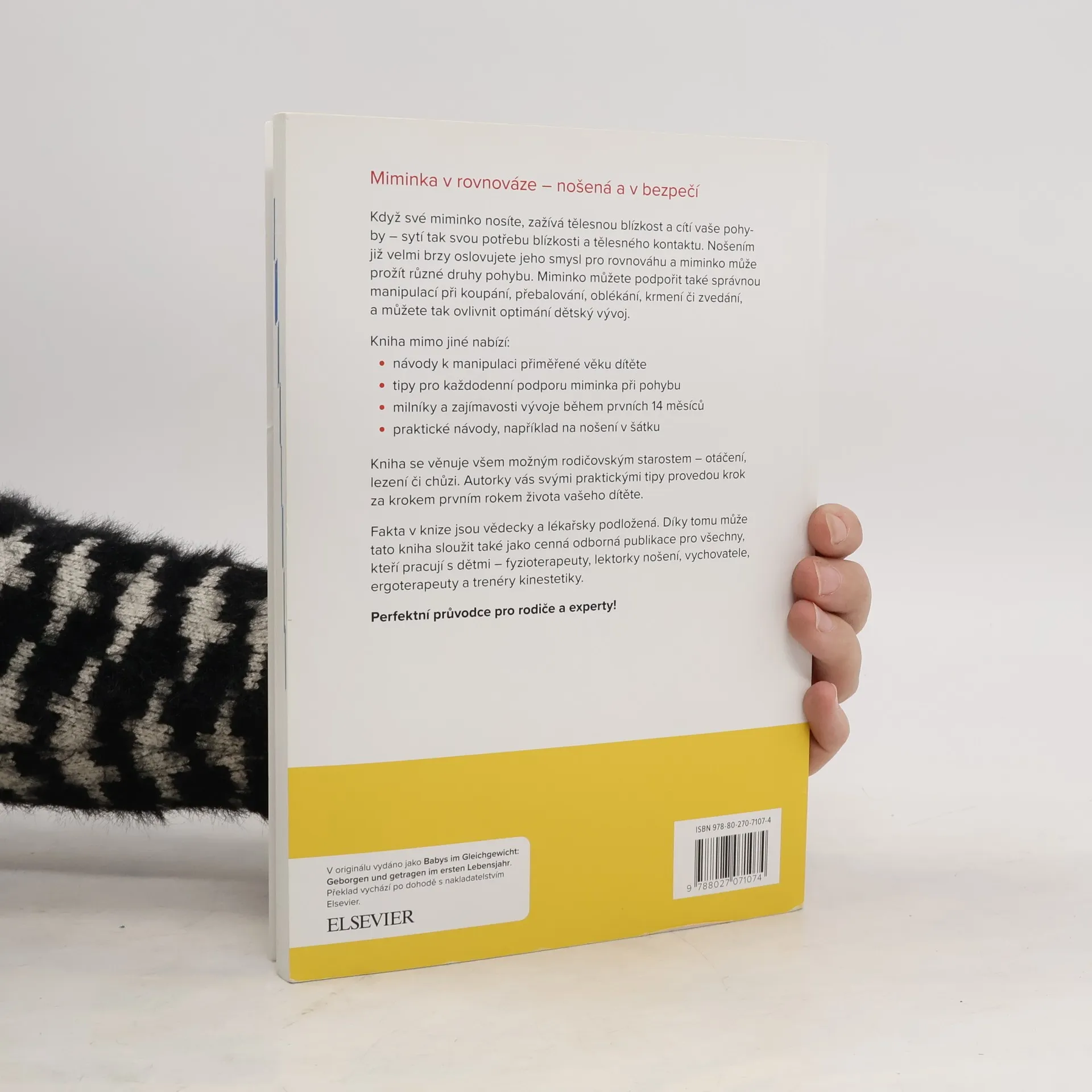 Proč kniha Miminka v rovnováze? Kniha se detailně věnuje nošení dětí v souvislosti s jejich psychomotorickým vývojem podle poznatků fyzioterapie – a právě propojením s tímto medicínským oborem je průkopnická, protože pozitivní účinky nošení dětí v šátcích a nosítkách nejsou dosud v dostatečné míře součástí výuky lékařství. Precizně propracovaná kniha Miminka v rovnováze založená na dlouhodobé osobní zkušenosti autorek tak oslovuje vedle rodičů i odborníky, kterým může posloužit jako učebnice. O čem dále je kniha? Kniha sleduje pohybový vývoj dítěte od prenatálního období přes jednotlivé milníky až do 14 měsíce života. Rozlišuje kvalitu a kvantitu pohybu. Hlavní pozornost je zaměřena na pohyb a dotek jako centrální moment dětského vývoje. V každém období se také věnuje dítěti jako nošenci, popisuje, jak nošení podporuje vývoj a jak se způsoby nošení proměňují s růstem dítěte.