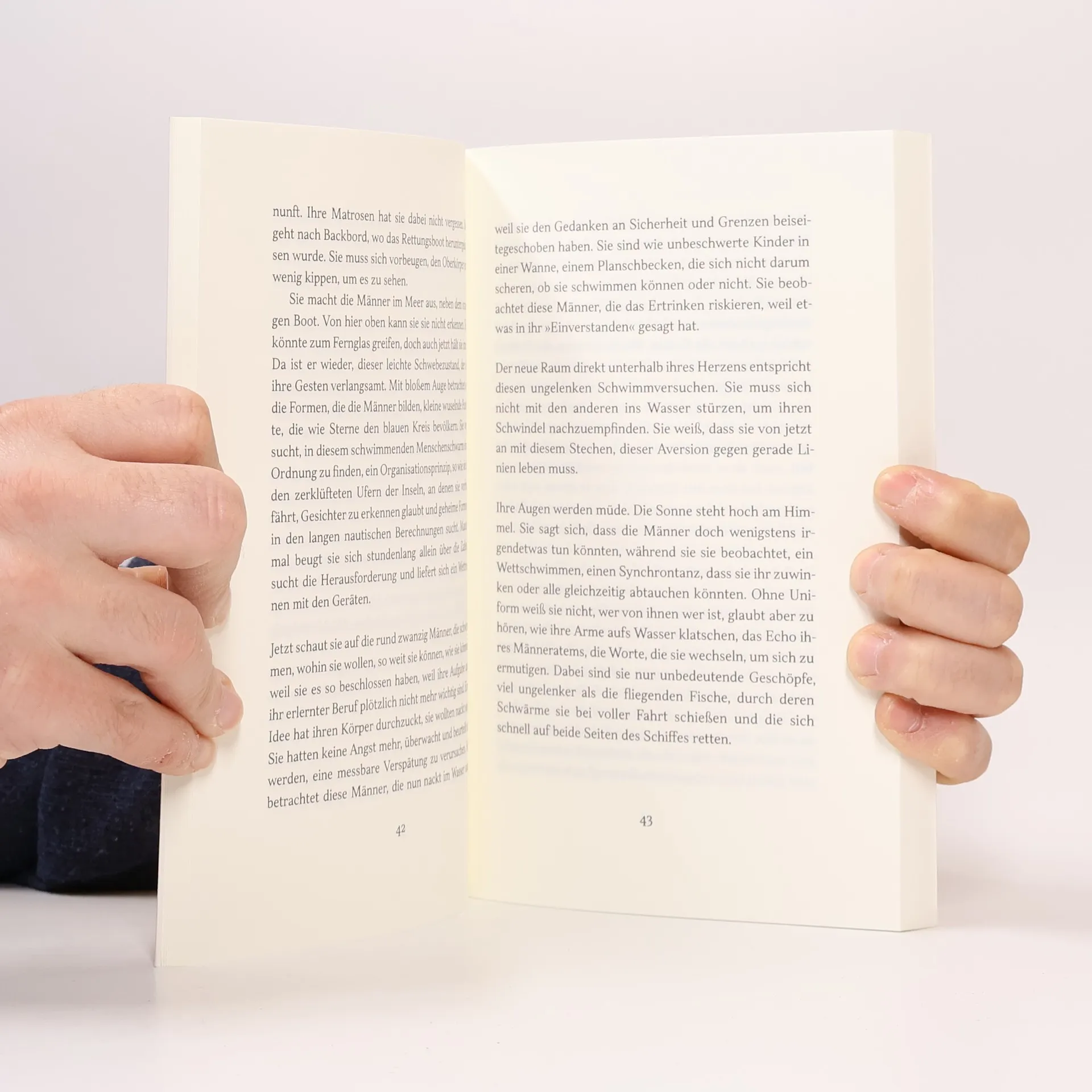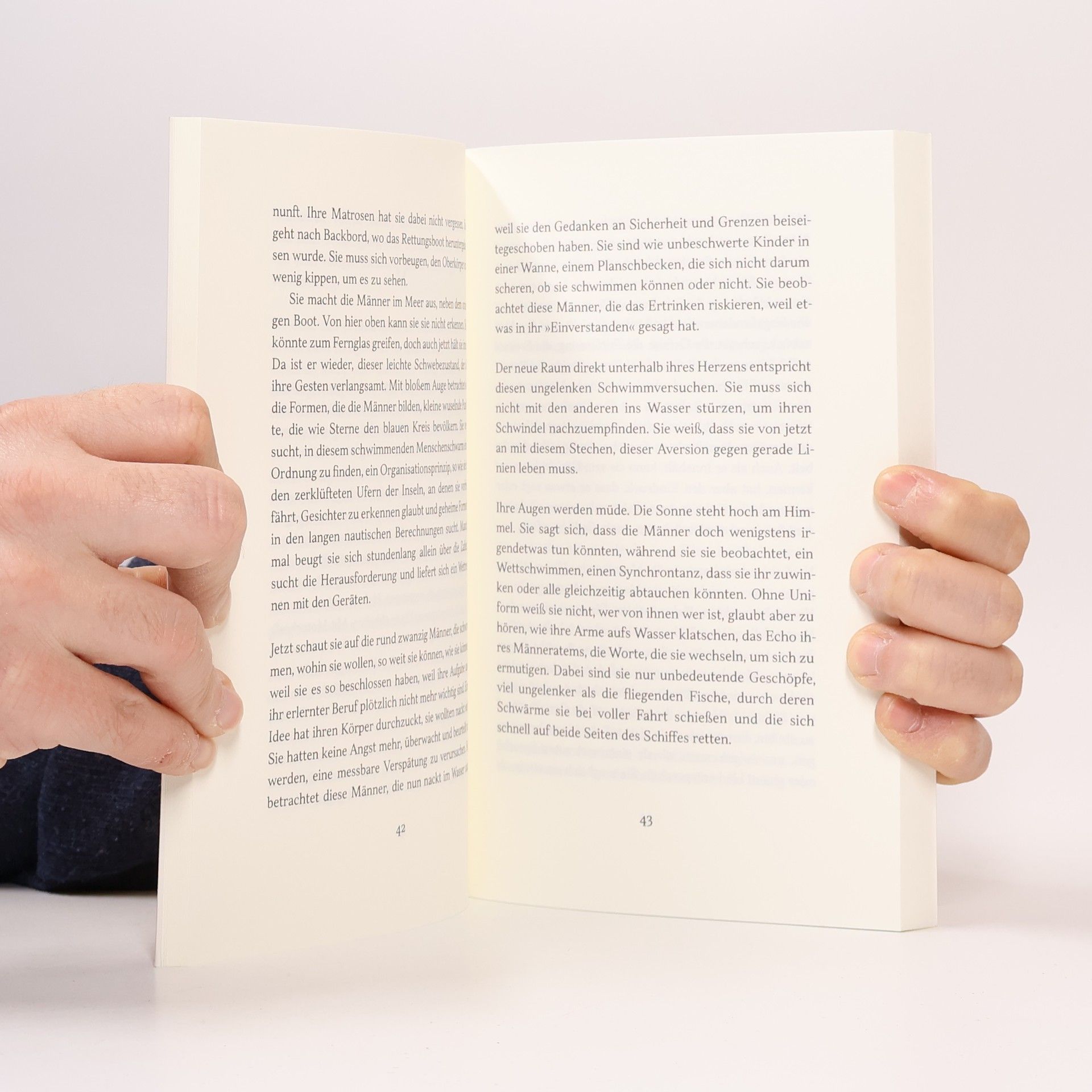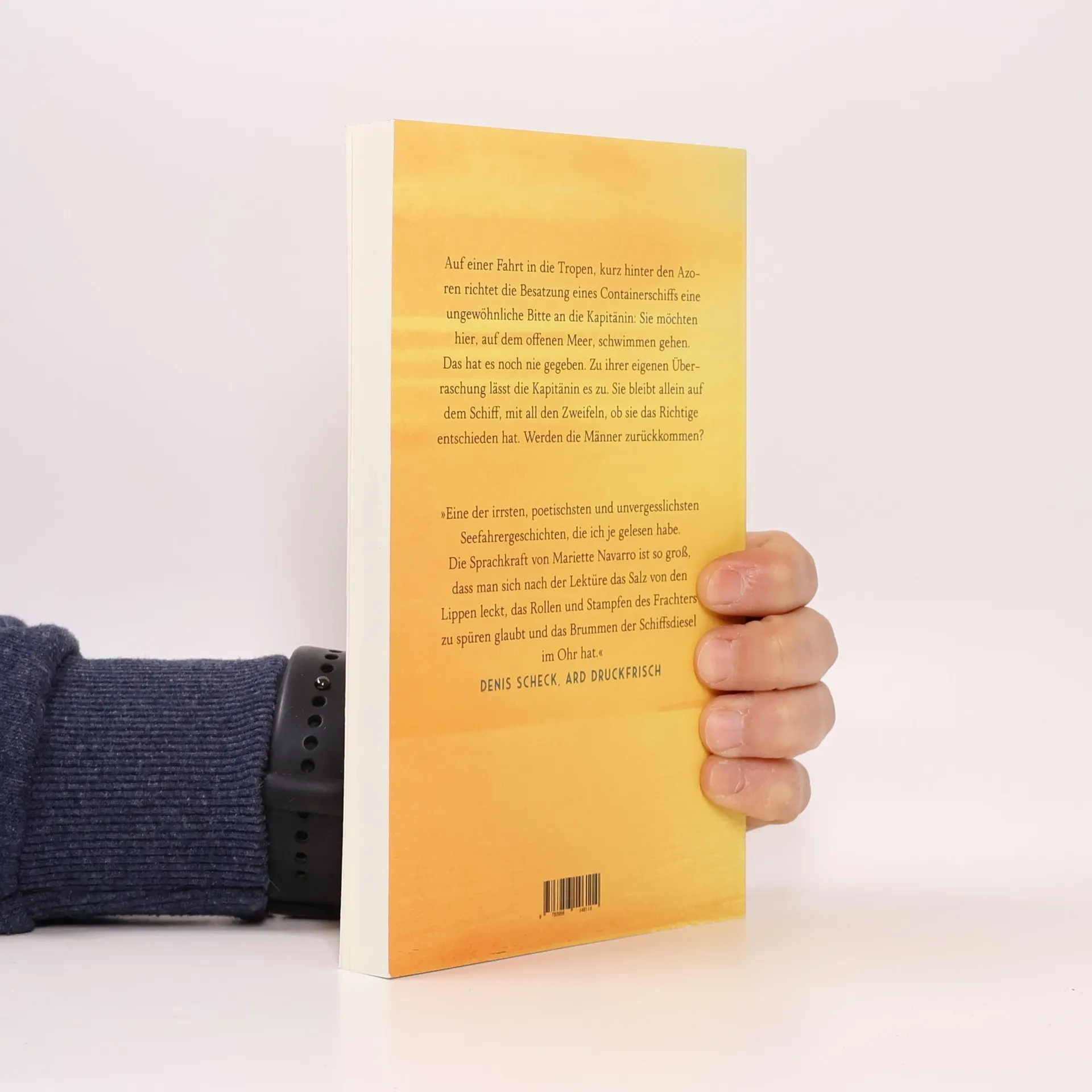 Die Besatzung eines Containerschiffs möchte einmal mitten auf dem offenen Meer schwimmen gehen. Ihre Kapitänin lässt sich tatsächlich darauf ein … Wie sich behaupten und gleichzeitig in Frage stellen, davon erzählt dieser wunderbar sinnliche Roman aus Frankreich, der u.a. mit dem Prix Léonora Miano ausgezeichnet wurde. »Erst hängen sie in der Luft. Dann tauchen sie zum allerersten Mal beide Füße in den Ozean. Sie gleiten hinein. Tausende Kilometer von jedem Strand entfernt.« Auf einer Fahrt in die Tropen, kurz hinter den Azoren richtet die Besatzung eines Containerschiffs eine ungewöhnliche Bitte an die Kapitänin: Sie möchten hier, auf dem offenen Meer, schwimmen gehen. Das hat es noch nie gegeben. Zu ihrer eigenen Überraschung lässt die Kapitänin es zu. Sie bleibt allein auf dem Schiff, mit all den Zweifeln, ob sie das Richtige entschieden hat. Werden die Männer zurückkommen? Das Schiff wird immer langsamer, ein mysteriöser Nebel kommt auf. Wieso kann die Kapitänin auf einmal das Herz des Schiffes schlagen hören? Und warum drängt sich ausgerechnet jetzt ihr Vater in die Erinnerung, der einst selbst zur See fuhr und seit einer Überfahrt kein Wort mehr sprach?