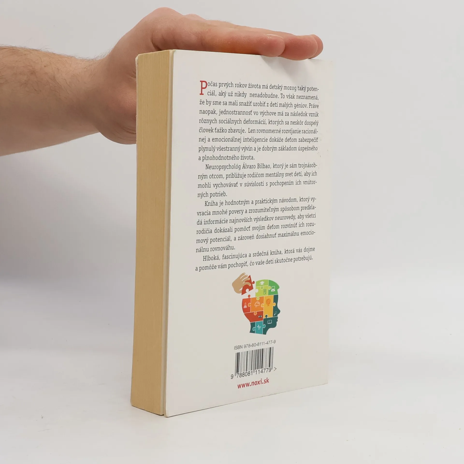 Ako môžete pomôcť svojmu dieťaťu v rozvíjaní jeho rozumového a emočného potenciálu Počas prvých rokov života má detský mozog taký potenciál, aký už nikdy nenadobudne. To však neznamená, že by sme sa mali snažiť urobiť z detí malých géniov. Práve naopak, jednostrannosť vo výchove má za následok vznik rôznych sociálnych deformácií, ktorých sa neskôr dospelý človek ťažko zbavuje. Len rovnomerné rozvíjanie racionálnej a emocionálnej inteligencie dokáže deťom zabezpečiť plynulý všestranný vývin a je dobrým základom úspešného a plnohodnotného života. Neuropsychológ Álvaro Bilbao, ktorý je sám trojnásobným otcom, približuje rodičom mentálny svet detí, aby ich mohli vychovávať v súvislosti s pochopením ich vnútorných potrieb. Kniha je hodnotným a praktickým návodom, ktorý vyvracia mnohé povery a zrozumiteľným spôsobom predkladá informácie najnovších výsledkov neurovedy, aby všetci rodičia dokázali pomôcť svojim deťom rozvinúť ich rozumový potenciál, a zároveň dosiahnuť maximálnu emocionálnu rovnováhu. Hlboká, fascinujúca a srdečná kniha, ktorá vás dojme a pomôže vám pochopiť, čo vaše deti skutočne potrebujú.