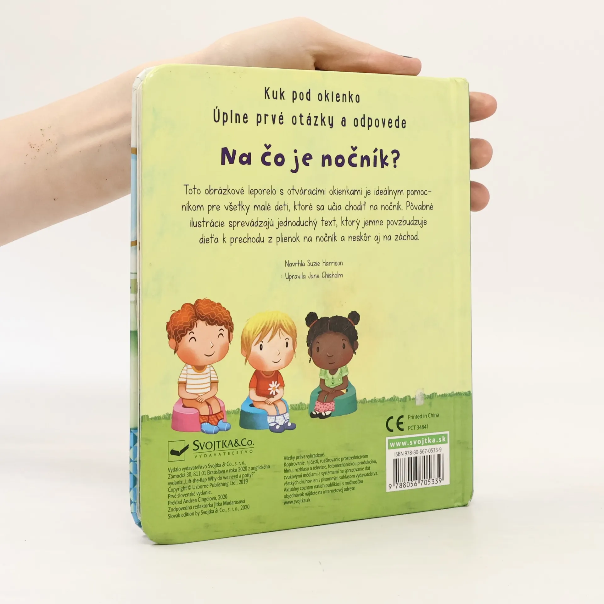 Kakáme všetci. Ale čo sa potom s vykakaným hovienkom stane? Odpovede nájdete pod okienkami v tejto knižke pre najmenších. Hovienko sa robí do plienky, splachuje sa do záchoda, zvieratká robia svoje hovienka vonku... Ale čo to vlastne hovienko je? Vieš, že sú chrobáky, ktorí si robia z hovienok guľôčky, a že králik svoje bobky dokonca je? Na všetky všetečné otázky detí na tému „Čo je to hovienko?“ nájdu bezradní rodičia odpovede v tejto úžasnej knižke s odklápacími okienkami.