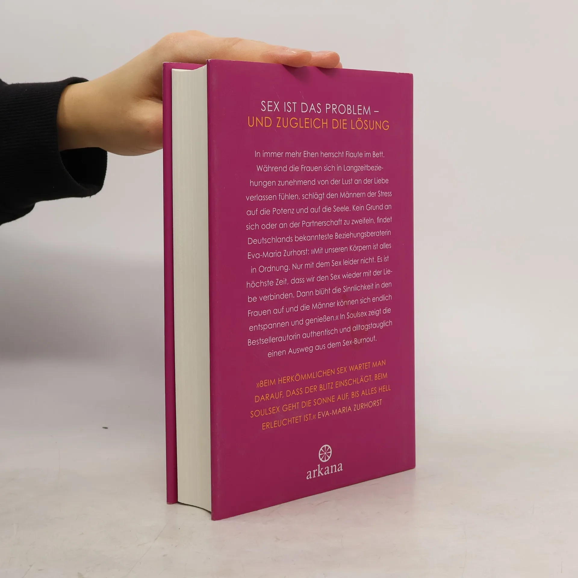 Sex ist das Problem – und zugleich die Lösung. Die Bestsellerautorin Eva-Maria Zurhorst hat mit ihrem ersten Buch »Liebe dich selbst und es ist egal, wen du heiratest« tausenden Frauen aus der Seele geschrieben. Ebenso einfühlsam, persönlich und leidenschaftlich enthüllt sie in diesem Buch das Geheimnis der Sexualität. Probleme mit der Sexualität bringt fast jedes Paar mit, das in die Praxis von Eva-Maria Zurhorst kommt. Frauen fühlen sich von der Lust an der Liebe verlassen und Männern schlägt Stress, Leistungsdruck oder Zurückweisung durch die Partnerin auf die Seele. Soulsex beschreibt Zurhorsts persönliches Wundermittel für die Heilung von Beziehungsstress und die Rückkehr der körperlichen Lust: Der Sex muss wieder mit dem Herzen verbunden werden. Soulsex zeigt Paaren den Weg, sich wieder neu für den Sex zu öffnen, Angst und Scham zu überwinden und sich ohne Druck genussvoll fallen zu lassen.