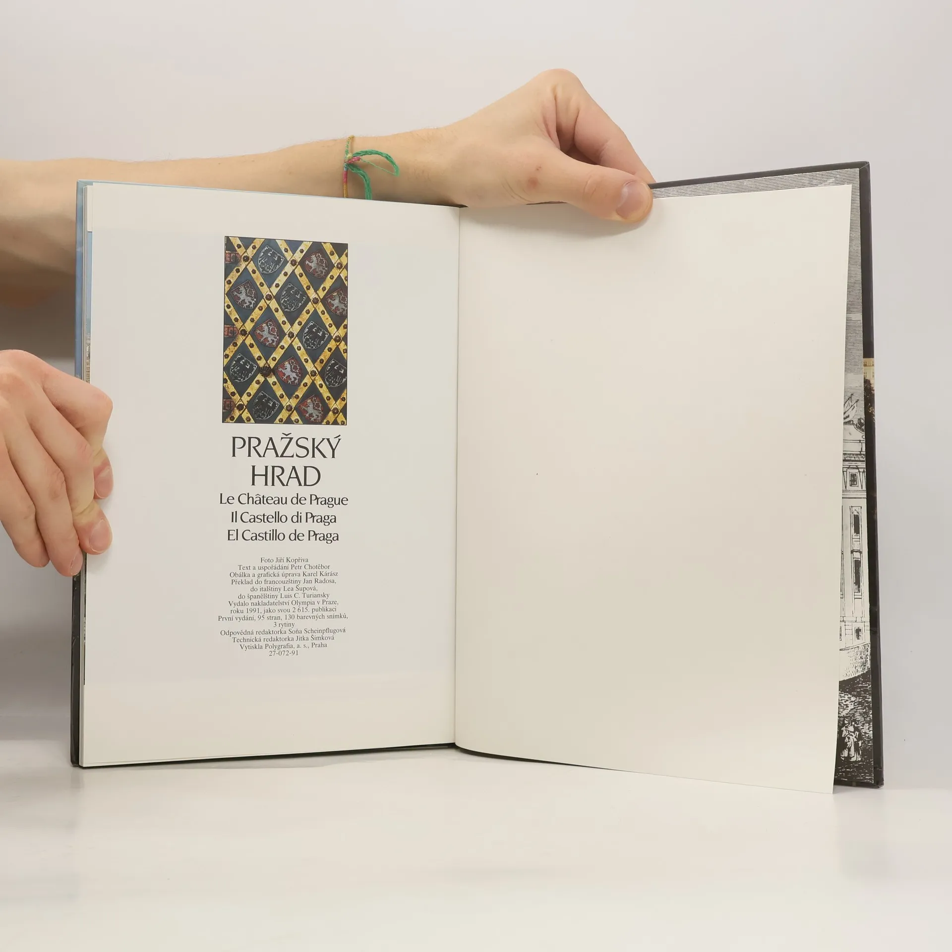 Fotografická publikace zachycuje jednotlivé objekty Pražského hradu, nahlíží do salónů, kanceláří a dalších reprezentativních místností, přibližuje památky ze svatovítského pokladu i malířské poklady z obrazárny. Na detailním snímku najdeme i korunovační klenoty. Řada fotografií vykresluje detaily interiérů z kostela sv. Víta a baziliky sv. Jiří. Oficiální ráz publikace podtrhují záběry hradní stráže. Stručný doprovodný text je ve čtyřech jazycích. 130 snímků, 3 rytiny.
