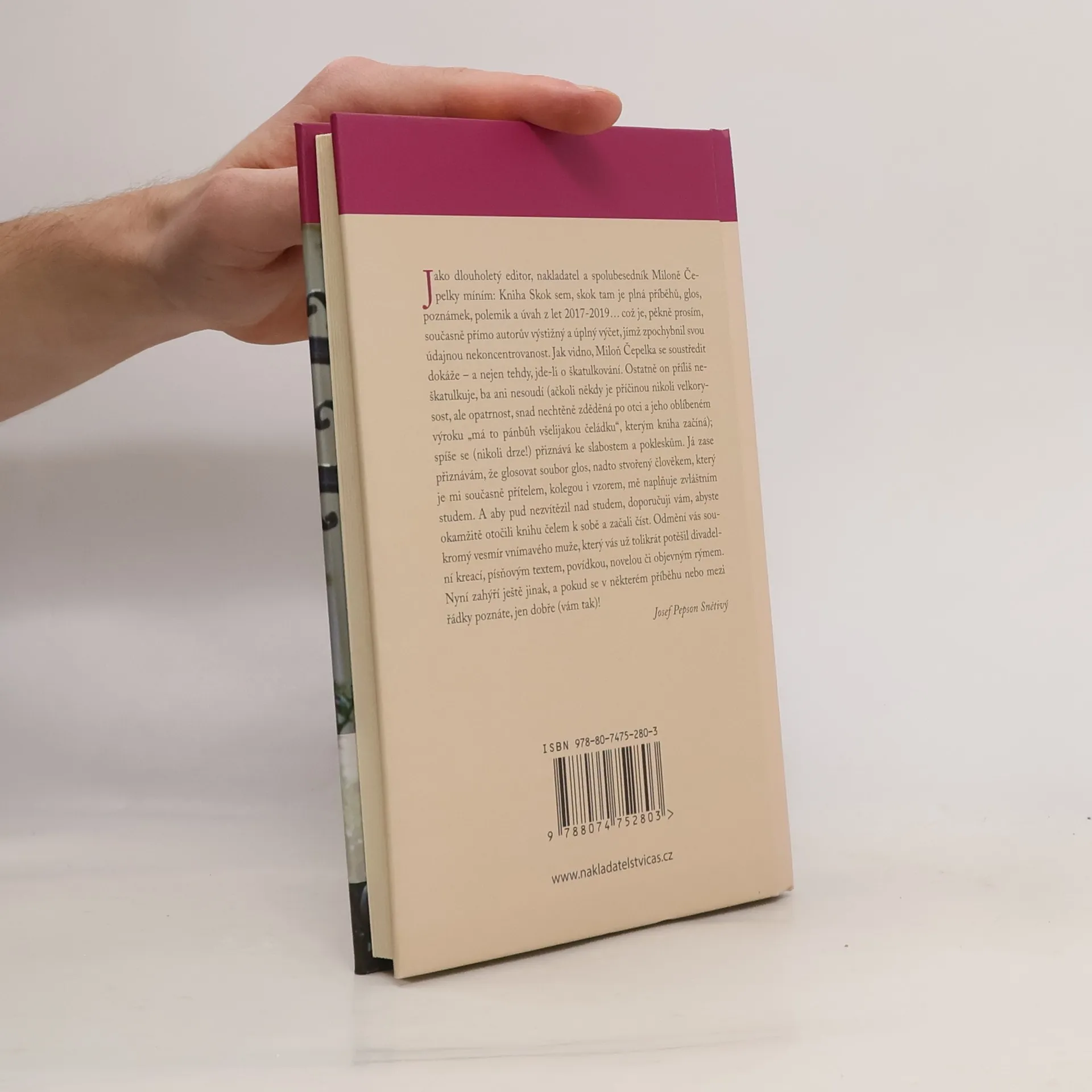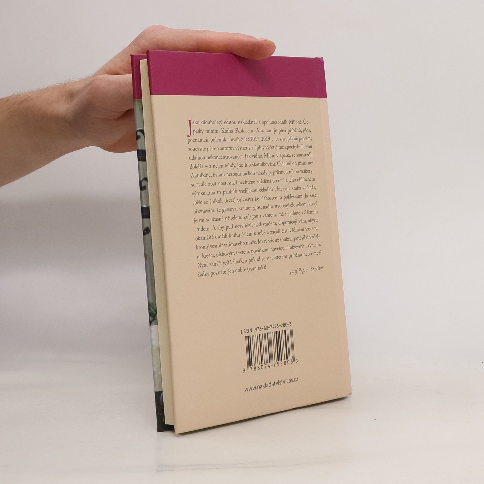 Dlouholetý editor, nakladatel a spolubesedník Miloně Čepelky Josef Pepson Snětivý říká o této publikaci, která vychází k třiaosmdesátým narozeninám všestranného umělce a spoluzakladatele Divadla Járy Cimrmana: „Kniha Skok sem, skok tam je plná příběhů, glos, poznámek, polemik a úvah z let 2017-2019… což je, pěkně prosím, současně přímo autorův výstižný a úplný výčet, jímž zpochybnil svou údajnou nekoncentrovanost. Jak vidno, Miloň Čepelka se soustředit dokáže – a nejen tehdy, jde-li o škatulkování. Ostatně on příliš neškatulkuje, ba ani nesoudí (ačkoli někdy je příčinou nikoli velkorysost, ale opatrnost, snad nechtěně zděděná po otci a jeho oblíbeném výroku ,má to pánbůh všelijakou čeládku‘, kterým kniha začíná); spíše se (nikoli drze!) přiznává ke slabostem a pokleskům. Já zase přiznávám, že glosovat soubor glos, nadto stvořený člověkem, který je mi současně přítelem, kolegou i vzorem, mě naplňuje zvláštním studem. A aby pud nezvítězil nad studem, doporučuji vám, abyste se do knihy začetli, a to rovněž soustředěně. Odmění vás soukromý vesmír vnímavého muže, který vás už tolikrát potěšil divadelní kreací, písňovým textem, povídkou, novelou či objevným rýmem. Nyní zahýří ještě jinak, a pokud se v některém příběhu nebo mezi řádky poznáte, jen dobře (vám tak)!“
