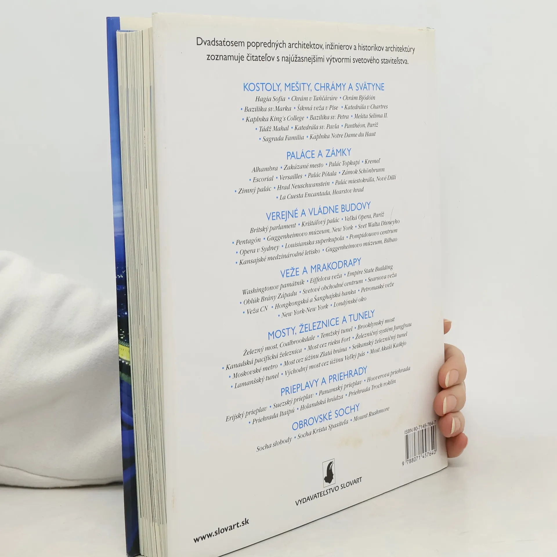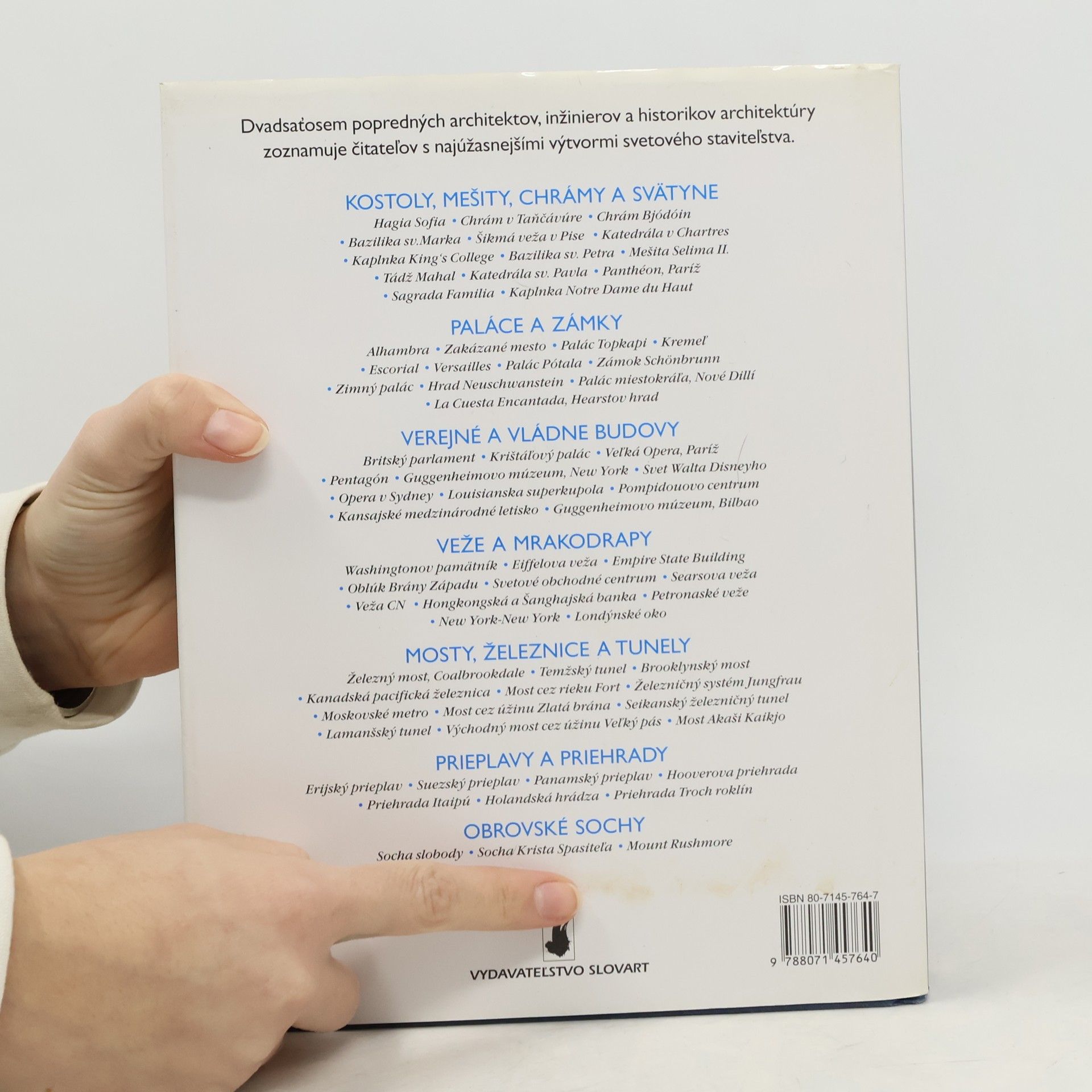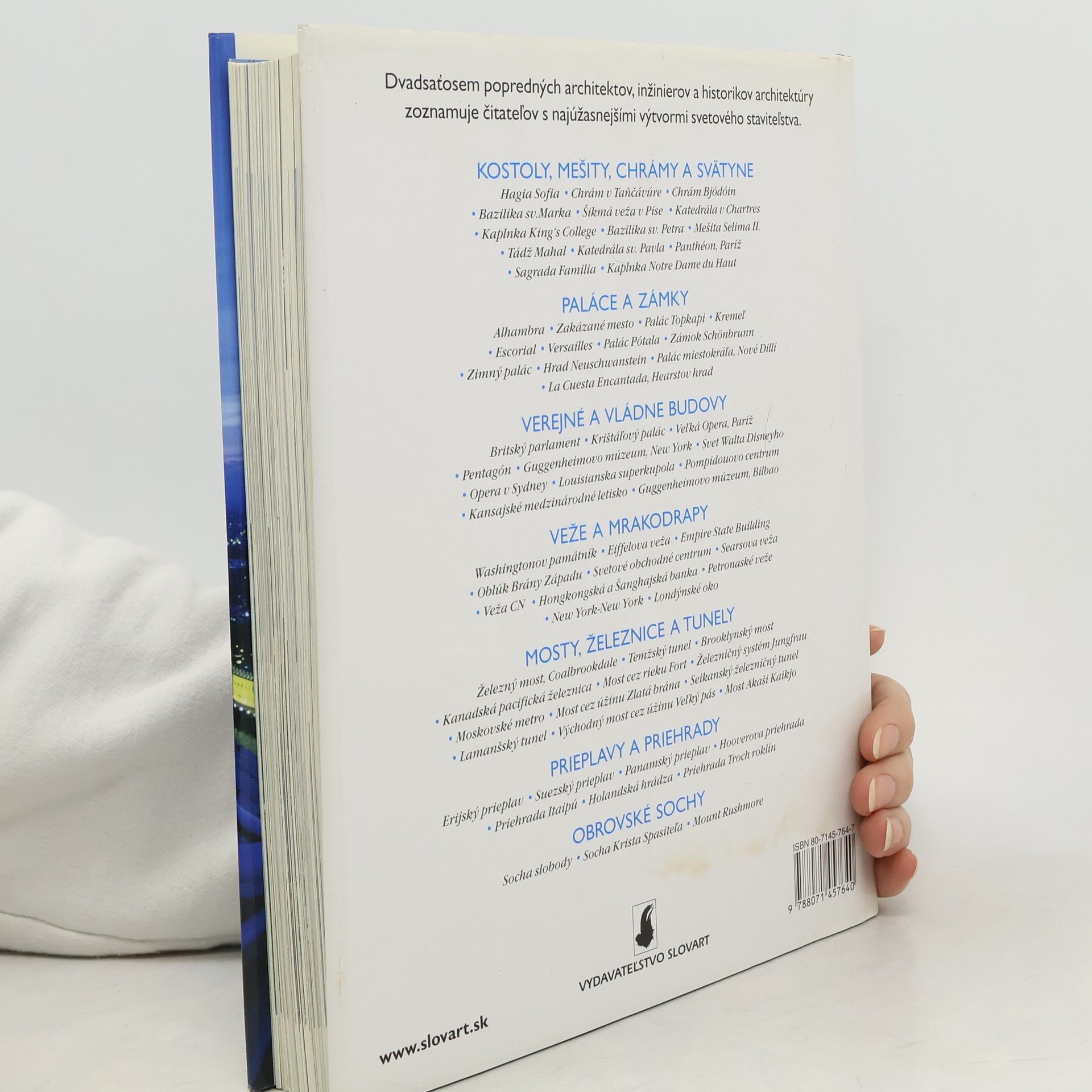 Dvadsaťosem popredných architektov, inžinierov a historikov architektúry zoznamuje čitateľov s najúžasnejšími výtvormi svetového staviteľstva. Bazilika sv.Petra, Tádž Mahal, palác Topkapi, Opera v Sydney, most cez úžinu Zlatá brána pri San Francisku – najslávnejšie stavby sveta upútavajú fantáziu a vzbudzujú údiv, či už ide o náboženské miesta, paláce moci alebo potešenia, mrakodrapy, mosty, priehrady alebo obrovské sochy. Ako dokázali postaviť v preplnenom New Yorku mrakodrap Empire State Building? Aké stroje používali na razenie tunela pod Lamanšským prieplavom? Prečo sa šikmá veža v Pise nakláňa – a prečo sa nezrúti? Ako je to možné, že visutý most Akaši Kaikjo dlhý takmer 4 km dokáže odolávať zemetraseniam a tajfúnom? A čo podopiera do výšky sa týčiace elegantné klenby katedrály v Chartres? V knihe Sedemdesiat zázrakov architektúry na takéto otázky odpovedá medzinárodný tím profesionálnych architektov, inžinierov a popredných historikov architektúry, ktorí mapujú pokrok ľudskej vynaliezavosti a tvorivosti, tak jako sa prejavoval pri realizácii stavieb od roku 500 nášho letopočtu až do súčasnosti.
