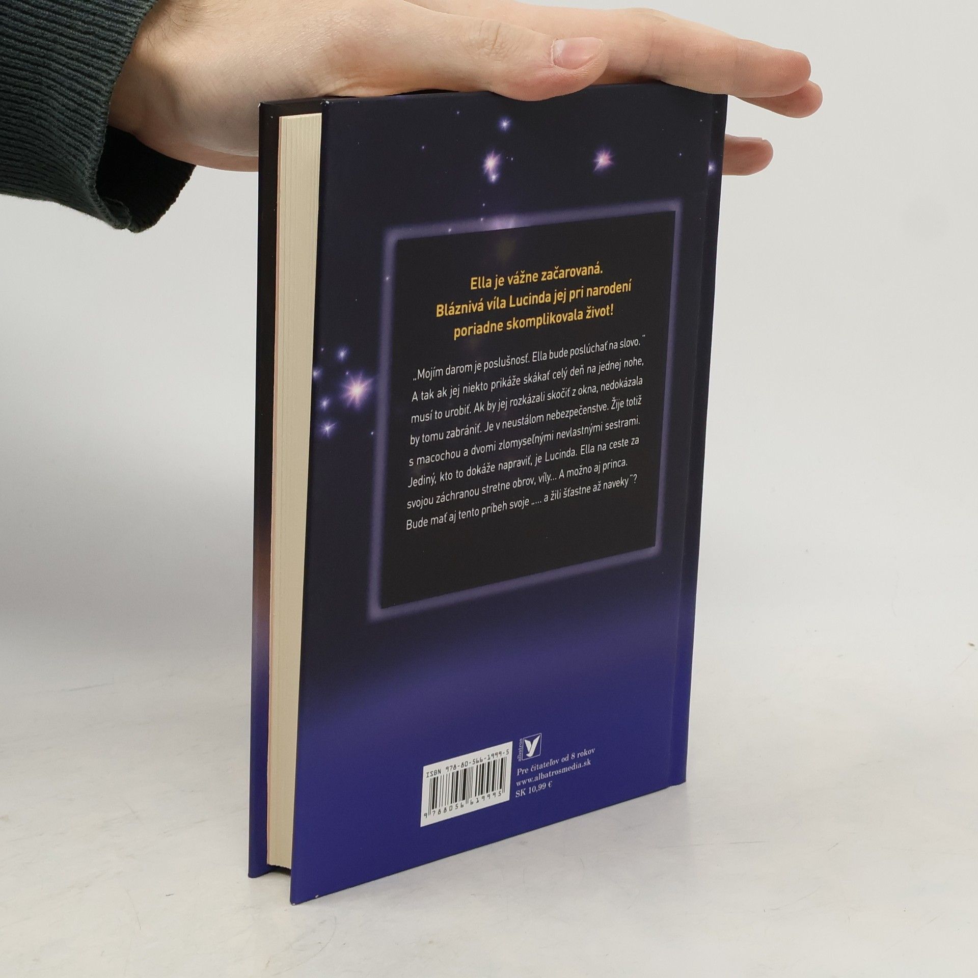 Ella je vážne začarovaná. Bláznivá víla Lucinda jej pri narodení poriadne skomplikovala život! A tak ak jej niekto prikáže skákať celý deň na jednej nohe, musí to urobiť. Ak by jej rozkázali skočiť z okna, nedokázala by tomu zabrániť. Je v neustálom nebezpečenstve. Žije totiž s macochou a dvomi zlomyseľnými nevlastnými sestrami. Jediný, kto to dokáže napraviť, je Lucinda. Ella na ceste za svojou záchranou stretne obrov, víly... A možno aj princa. Bude mať aj tento príbeh svoje „žili šťastne až naveky"?