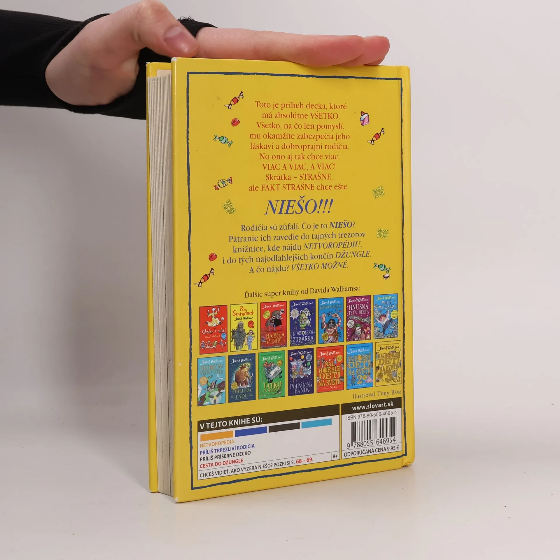 Svetoznámy britský komik a autor detských bestsellerov David Walliams už napísal množstvo skvelých kníh o neposlušných, zlostných, papuľnatých, drzých, nadutých a rozmaznaných deťoch, dokonca aj o tých, čo sú fakt najhoršie na svete. Ale toto tu ešte nebolo! Vymyslel príbeh decka, ktoré má absolútne všetko. Všetko, na čo len pomyslí, mu okamžite zabezpečia jeho láskaví a dobroprajní rodičia. No ono aj tak chce viac. Viac a viac, a viac! Skrátka – strašne chce, ale fakt strašne chce ešte NIEŠO! Rodičia sú zúfalí. Čo je to NIEŠO? Pátranie ich zavedie do tajných trezorov knižnice, kde nájdu Netvoropédiu, i do tých najodľahlejších končín džungle. A čo nájdu? Všetko možné. Tak to poďte hľadať s nimi. Len pozor, aby ste pritom neexplodovali od smiechu!
