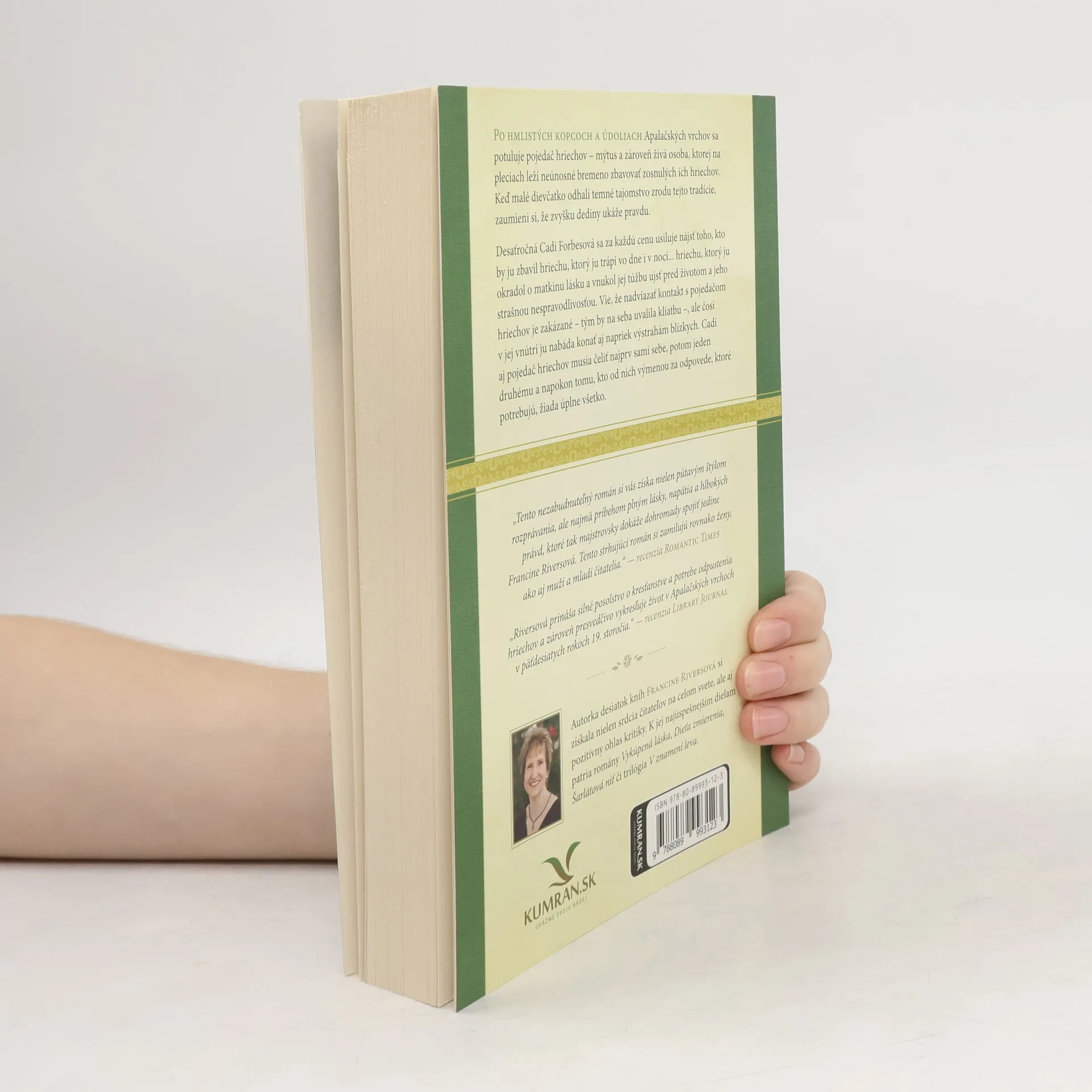Obľúbená autorka Francine Riversová v knihe Posledný pojedač hriechov ponúka pútavý príbeh o utrpení, hľadaní a vykúpení, ktorý sa odohráva v polovici 19. storočia v Apalačských horách. Uzavretú komunitu európskych prisťahovalcov udržiavajúcu starý mýtus o ľudskom „pojedačovi hriechov“, ktorý mŕtvych zbavuje ich previnení, privádza k Pravde desaťročné dievčatko. Cadi Forbesová sa za každú cenu usiluje nájsť toho, kto by ju zbavil ťaživého hriechu, pre ktorý prišla o matkinu lásku a začala túžiť uniknúť životu a jeho príšernej spravodlivosti. Cadi netuší, že nie je jediná hľadajúca. Ona aj pojedač hriechov musia čeliť najprv sami sebe, potom jeden druhému a napokon tomu, kto od nich výmenou za odpovede, ktoré potrebujú, žiada úplne všetko.
