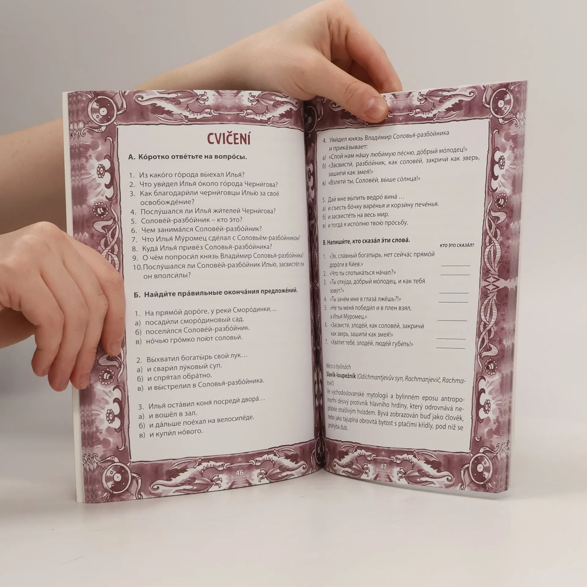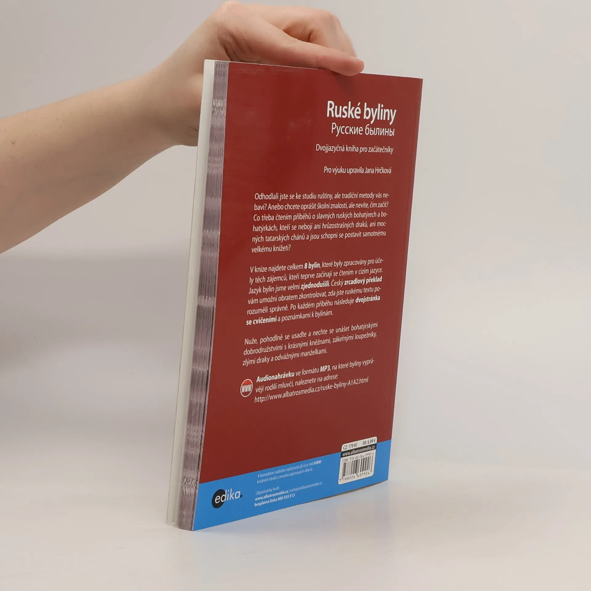 Dvojjazyčná kniha pro začátečníky V knize najdete celkem 8 bylin, které byly zpracovány pro účely těch zájemců, kteří teprve začínají se čtením v cizím jazyce. Jazyk bylin jsme velmi zjednodušili. Český zrcadlový překlad vám umožní obratem zkontrolovat, zda jste ruskému textu porozuměli správně. Po každém příběhu následuje dvojstránka se cvičeními a poznámkami k bylinám. Audionahrávka ve formátu MP3, na které byliny vyprávějí rodilí mluvčí, je zdarma ke stažení na webu.