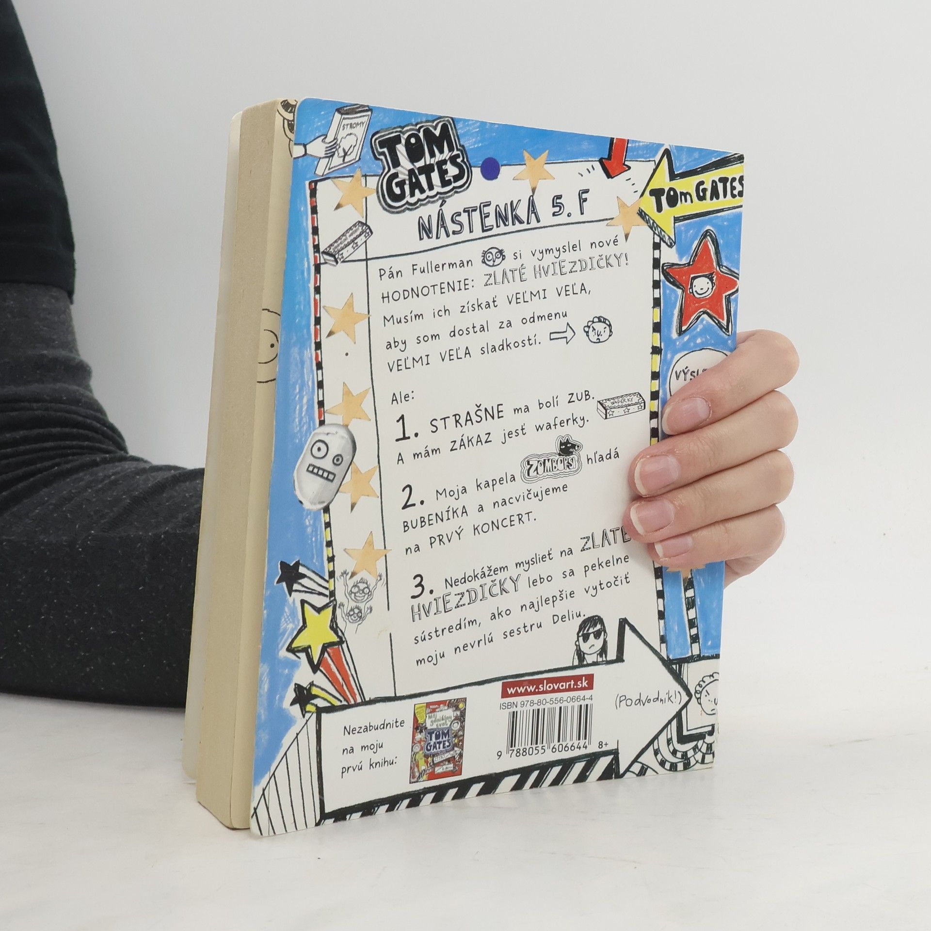 Druhé pokračovanie úplne šialených nápadov Toma Gatesa. Aj na túto knihu platí upozornenie: NAJVTIPNEJŠIE, ČO TU KEDY BOLO! Tom má dva týždne prázdnin, a teda aj hromadu času na životne dôležité veci. Hurá! Môže zabudnúť na školu a otravného Marcusa Meldrewa a využiť všetku svoju energiu na podstatné veci. Veci ako: vymýšľanie nových spôsobov, ako vytočiť svoju staršiu sestru Deliu, skúšanie v kapele Psie príšery – rodiacej sa hviezde rockového neba, pozeranie telky a jedenie karamelových tyčiniek. Skvelé! Nad Tomovou pohodou sa však zbierajú mračná v podobe jeho divnej staršej sestry Delie. Keď jeho geniálne plány skrížia nečakané problémy, musí vytiahnuť tie najlepšie zo svojich výhovoriek. Tento hysterický denník plný čmáraníc, čarbaníc, príbehov a vtipov prináša viac chaotického šialenstva z bláznivého sveta Toma Gatesa.