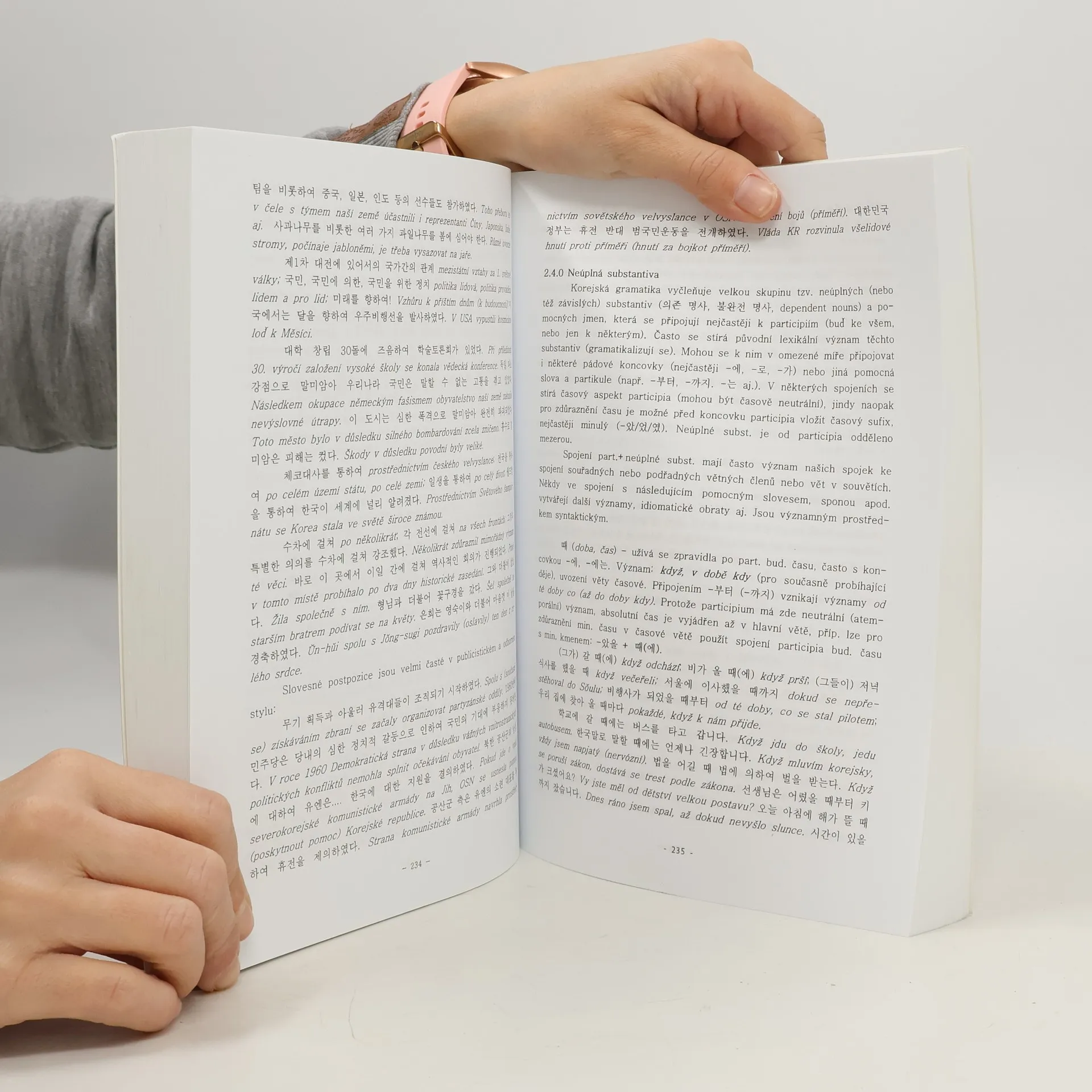 Tato publikace je první knihou v češtině, popisující systémově gramatiku současné korejštiny. Po stručném úvodu o vytvoření originální korejské hláskové abecedy (Systém správných hlásek pro vzdělání lidu, 1443) je členěna do oddílů I. Grafemický a fonologický systém, II. Morfologie, III. Syxntax. Zvláštní pozornost je věnována složitému honorifikačnímu systému. Výklad je doplněn četnými příklady, poznámkami o rozdílech pravopisu v Korejské republice a v KLDR, purifikačním hnutí, rejstříkem gamatických morfémů a přehledem transkripcí korejského písma do latinky. Kniha je určena pro studenty koreanistiky a orientalisty, případně badatele v oblasti srovnávací lingvistiky.