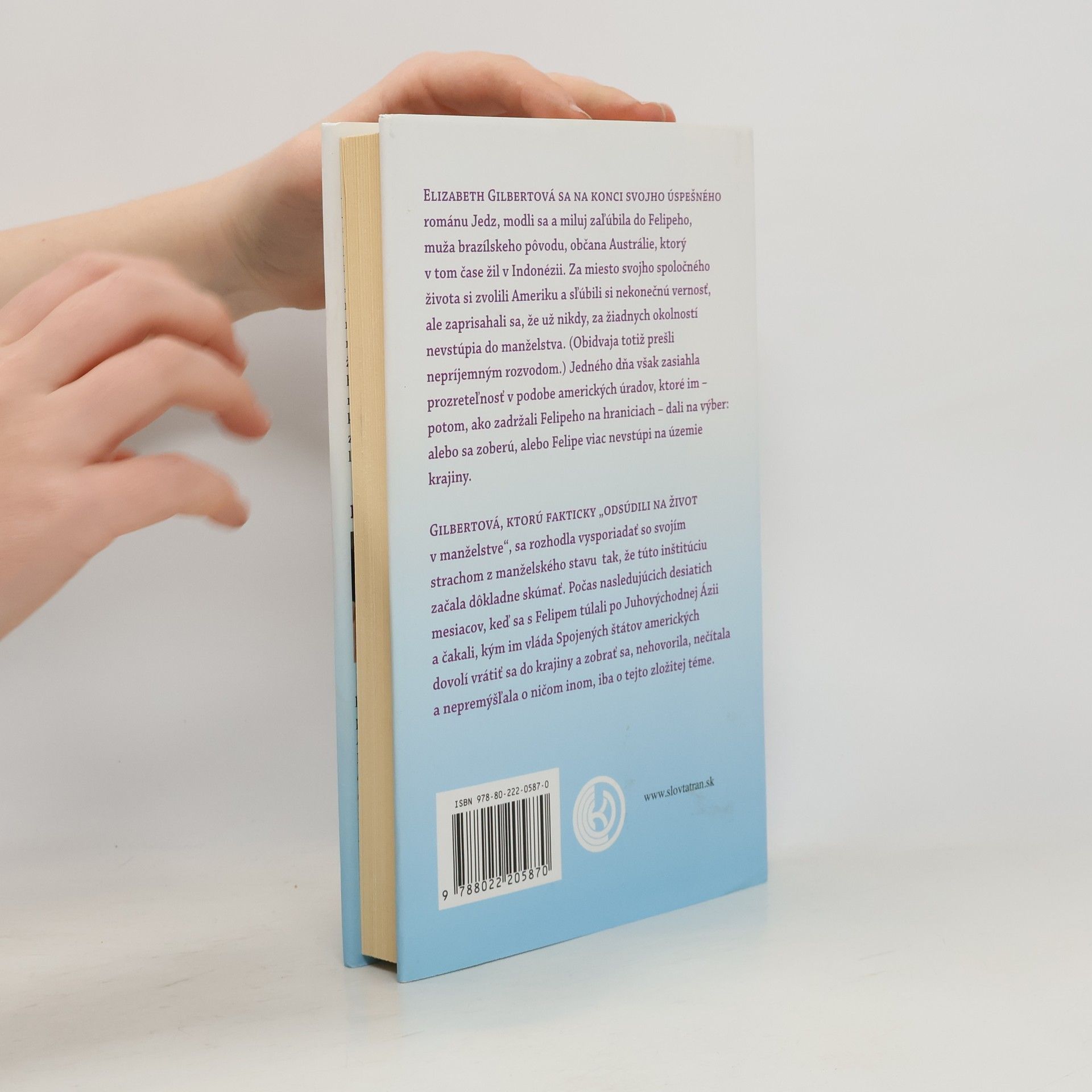 Voľné pokračovanie románu Jedz, modli sa a miluj! Elizabeth Gilbertová sa na konci svojho úspešného románu zaľúbila do Felipeho, muža brazílskeho pôvodu žijúceho v Indonézii. Spoločne sa rozhodli žiť v Amerike a sľúbili si vernosť, avšak bez manželstva, ktoré obaja zažili v nepríjemných rozvodoch. Ich plány sa zmenili, keď americké úrady zadržali Felipeho na hraniciach a dali im na výber: buď sa vezmú, alebo Felipe nebude môcť vstúpiť do krajiny. Gilbertová sa rozhodla čeliť svojmu strachu z manželstva a začala túto inštitúciu dôkladne skúmať. Počas desiatich mesiacov, keď sa s Felipem túlali po Juhovýchodnej Ázii a čakali na povolenie vrátiť sa do USA, sa sústredila len na túto zložitú tému. Príbeh rozpráva o jej snahe zmieriť sa s manželstvom prostredníctvom úvah, štúdia dejín a rozhovorov s rôznymi ľuďmi. Gilbertová otvorene preskúmava otázky kompatibility, vernosti, rodinnej tradície, očakávaní spoločnosti a rizík rozvodu. Rúcajú sa mýty a vyvracajú obavy, pričom sa hľadá historická perspektíva. Kniha sa stáva oslavou lásky so všetkými jej zložitými dôsledkami v reálnom svete.