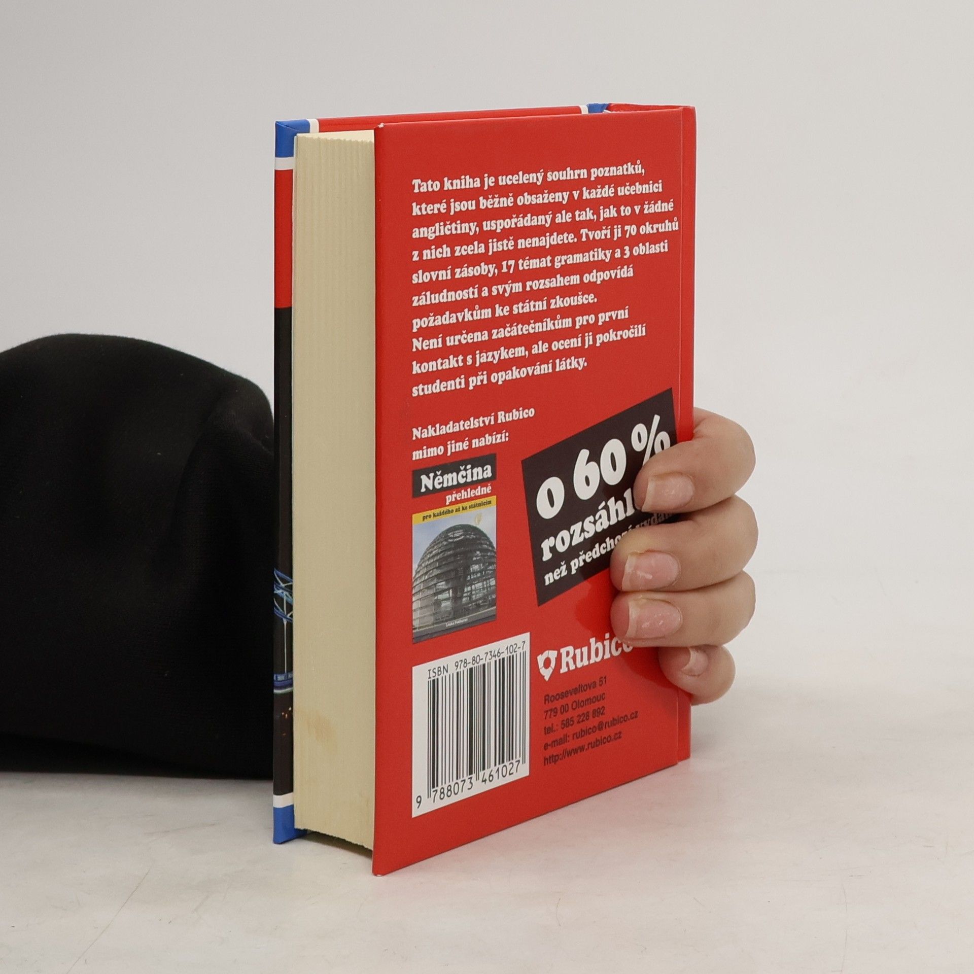 3. vydání Tato kniha je ucelený souhrn poznatků běžně obsažených v každé učebnici angličtiny. Liší se ale jejich uspořádáním, které v žádné z nich zcela jistě nenajdete. Není určena začátečníkům pro první kontakt s jazykem, ale ocení ji pokročilí studenti při opakování látky. Rozsah učebnice odpovídá požadavkům ke státní zkoušce z angličtiny. Celá látka je rozčleněna do 70 okruhů slovní zásoby, 17 oblastí gramatiky a 3 souborů záludností.