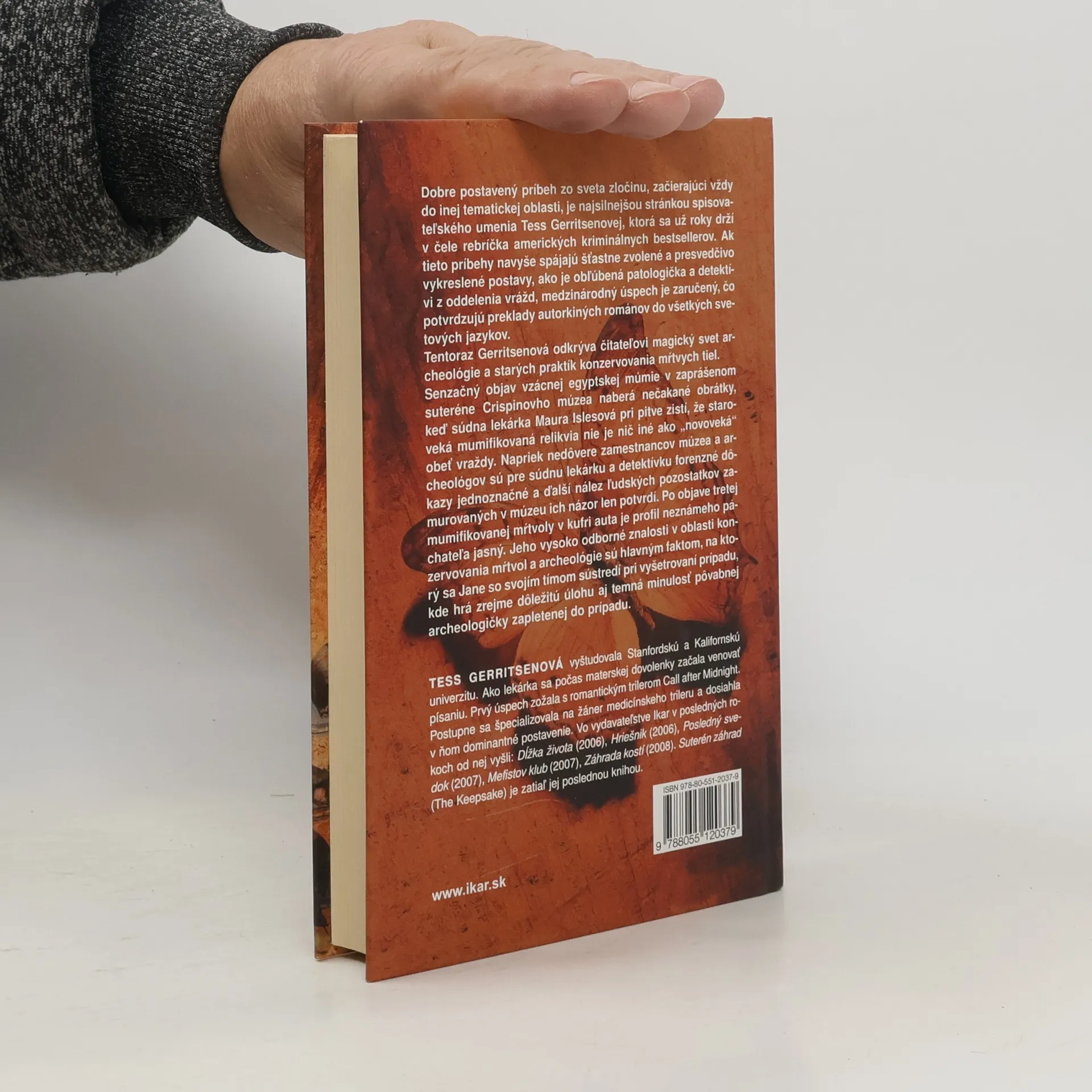 Tentoraz Gerritsenová odkrýva čitateľovi magický svet archeológie a starých praktík konzervovania mŕtvych tiel. Senzačný objav vzácnej egyptskej múmie v zaprášenom suteréne Crispinovho múzea naberá nečakané obrátky, keď súdna lekárka Maura Islesová pri pitve zistí, že staroveká mumifikovaná relikvia nie je nič iné ako „novoveká“ obeť vraždy. Napriek nedôvere zamestnancov múzea a archeológov sú pre súdnu lekárku a detektívku forenzné dôkazy jednoznačné a ďalší nález ľudských pozostatkov zamurovaných v múzeu ich názor len potvrdí. Po objave tretej mumifikovanej mŕtvoly v kufri auta je profil neznámeho páchateľa jasný. Jeho vysoko odborné znalosti v oblasti konzervovania mŕtvol a archeológie sú hlavným faktom, na ktorý sa Jane so svojím tímom sústredí pri vyšetrovaní prípadu, kde hrá zrejme dôležitú úlohu aj temná minulosť pôvabnej archeologičky zapletenej do prípadu.