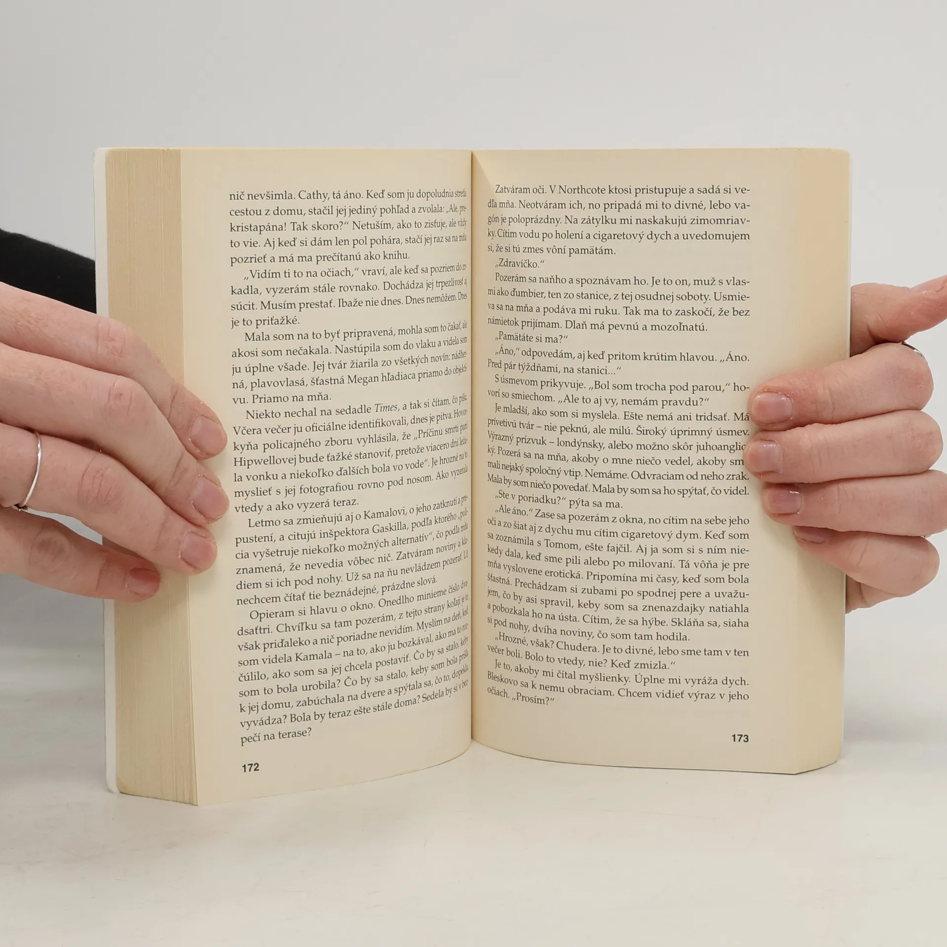 Rachel každé ráno cestuje tým istým vlakom do Londýna. Vie, že pri jednom návestidle spoj vždy zastaví a že si chvíľu môže prezerať domy s malými záhradkami. Dokonca má pocit, akoby obyvateľov jedného z nich už poznala. Volá ich Jess a Jason a ich život sa jej zdá dokonalý. Škoda, že ona nemala toľko šťastia. Rachelino manželstvo sa rozpadlo, nedávno prišla o prácu, býva v podnájme a každý deň predstiera, že chodí do roboty. Potom však uvidí niečo šokujúce - oznam v novinách, že „Jess", pani dokonalá, je nezvestná - a odrazu sa všetko zmení. Rachel má konečne šancu stať sa súčasťou života, ktorý pozorovala len z diaľky, a ukázať, že je oveľa viac ako iba dievča vo vlaku.