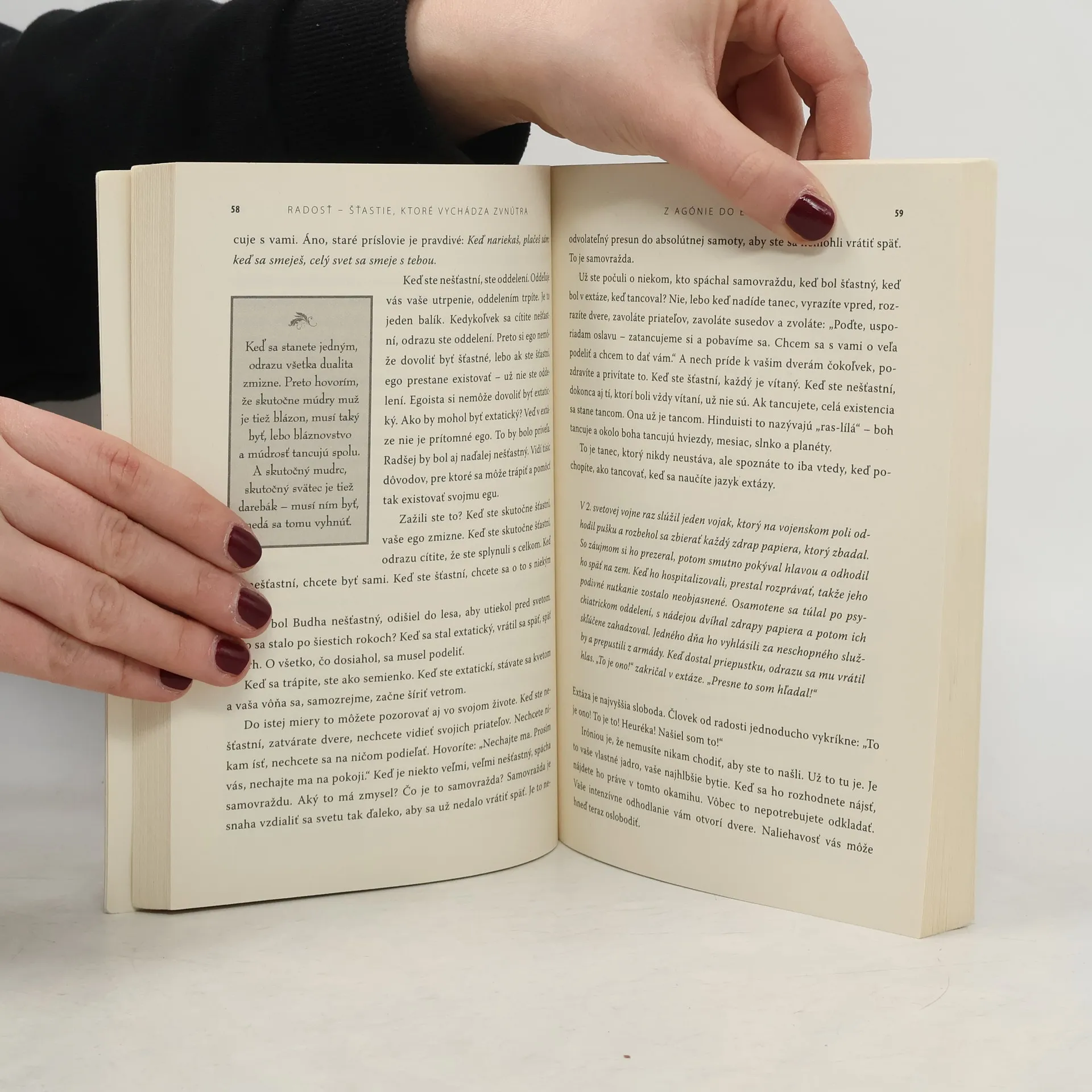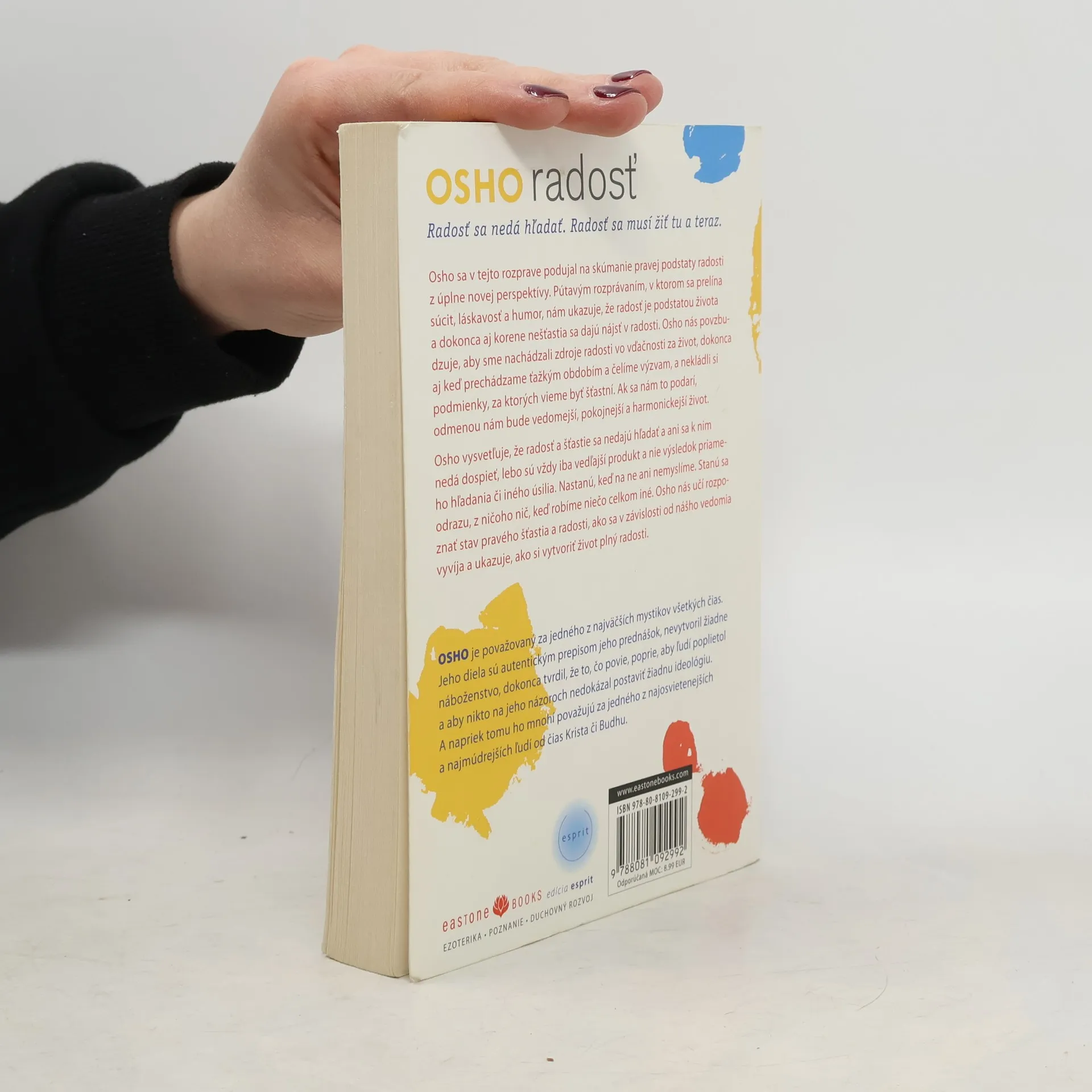 Radosť sa nedá hľadať. Radosť sa musí žiť tu a teraz. Radosť a šťastie sa nedajú hľadať a ani sa k nim nedá dospieť, lebo sú vždy iba vedľajší produkt a nie výsledok priameho hľadania či iného úsilia. Nastanú, keď na ne ani nemyslíme. Stanú sa odrazu, z ničoho nič, keď robíme niečo celkom iné. Osho sa v tejto rozprave podujal na skúmanie pravej podstaty radosti z úplne novej perspektívy. Pútavým rozprávaním, v ktorom sa prelína súcit, láskavosť a humor, nám ukazuje, že radosť je podstatou života a dokonca aj korene nešťastia sa dajú nájsť v radosti. Osho nás povzbudzuje, aby sme nachádzali zdroje radosti vo vďačnosti za život, dokonca aj keď prechádzame ťažkým obdobím a čelíme výzvam, a nekládli si podmienky, za ktorých vieme byť šťastní. Ak sa nám to podarí, odmenou nám bude vedomejší, pokojnejší a harmonickejší život.