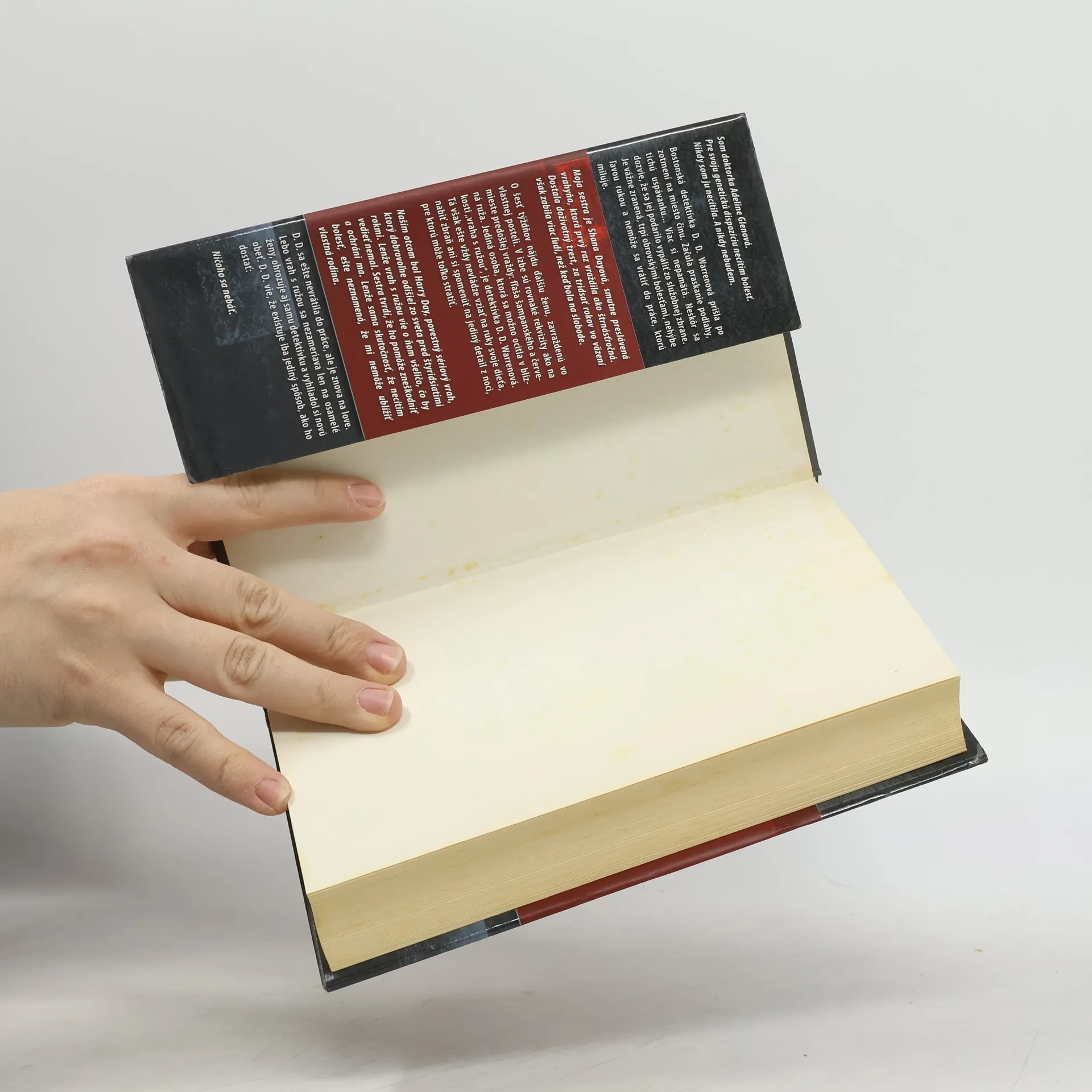 Som doktorka Adeline Glenová a necítim bolesť. Bostonská detektívka D. D. Warrenová sa po zotmení dostáva na miesto činu, kde zažíva praskanie podlahy a tichú uspávanku, ale nič si nepamätá. Neskôr zistí, že sa jej podarilo vystreliť zo služobnej zbrane, je vážne zranená a nemôže sa vrátiť do práce, ktorú miluje. Moja sestra, Shana Dayová, je notoricky známa vrahyňa, ktorá prvýkrát vraždila ako štrnásťročná a vo väzení zabila viac ľudí než na slobode. O šesť týždňov neskôr nájdu ďalšiu ženu zavraždenú vo vlastnej posteli, pričom na mieste sú rovnaké rekvizity ako predtým: fľaša šampanského a červená ruža. D. D. je jediná, ktorá sa mohla ocitnúť v blízkosti „vraha s ružou“, no stále sa nevie postarať o svoje dieťa ani si spomenúť na detaily z noci, ktorá jej zmenila život. Náš otec, Harry Day, bol sériový vrah, ktorý pred štyridsiatimi rokmi dobrovoľne odišiel zo sveta. Vrah s ružou však vie o ňom viac, než by mal. Shana tvrdí, že mi pomôže, ale to, že necítim bolesť, neznamená, že mi nemôže ublížiť vlastná rodina. D. D. sa ešte nevrátila do práce, ale je opäť na love, pretože vrah s ružou ohrozuje aj jej. D. D. vie, že jediný spôsob, ako ho dostať, je nebojácnosť.