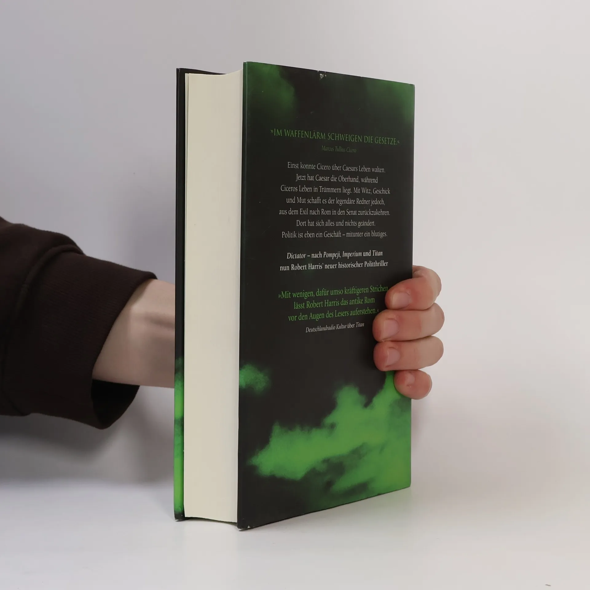Cicero, größter Redner seiner Zeit, weilt mit seinem Sekretär Tiro im Exil. Da er seinen politischen Feind Caesar zu unterstützen verspricht, kann er nach Rom zurückkehren, wo er sich wieder zu öffentlichem Ansehen emporkämpft. Genial und fehlbar, angsterfüllt und doch unbändig mutig – der mit sich ringende Mensch hinter dem Politiker Cicero macht die Geschichte so unwiderstehlich. Dictator umfasst bedeutsame Momente der Menschheitsgeschichte: den Untergang der römischen Republik, den folgenden Bürgerkrieg, die Enthauptung von Pompeius und den Meuchelmord an Caesar. Das Thema jedoch ist zeitlos: Wie lässt sich politische Freiheit gegen skrupellosen Ehrgeiz, korrumpierte Wahlen und den verderblichen Einfluss endloser Auslandseinsätze schützen?