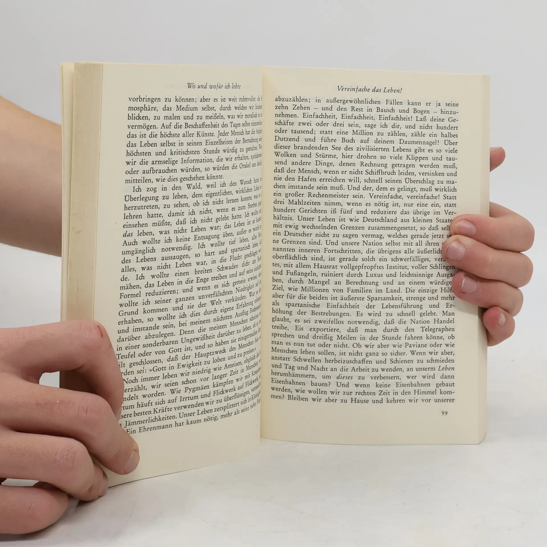 Um die Frage "Wie soll und will ich leben?" zu beantworten, zieht sich Thoreau für zwei Jahre in eine selbstgebaute Blockhütte am Waldensee zurück. Erkenntnis seines Experimentes ist, dass der Weg zu sich selbst bei den einfachen Dingen und einer gelasseneren Gangart beginnt.