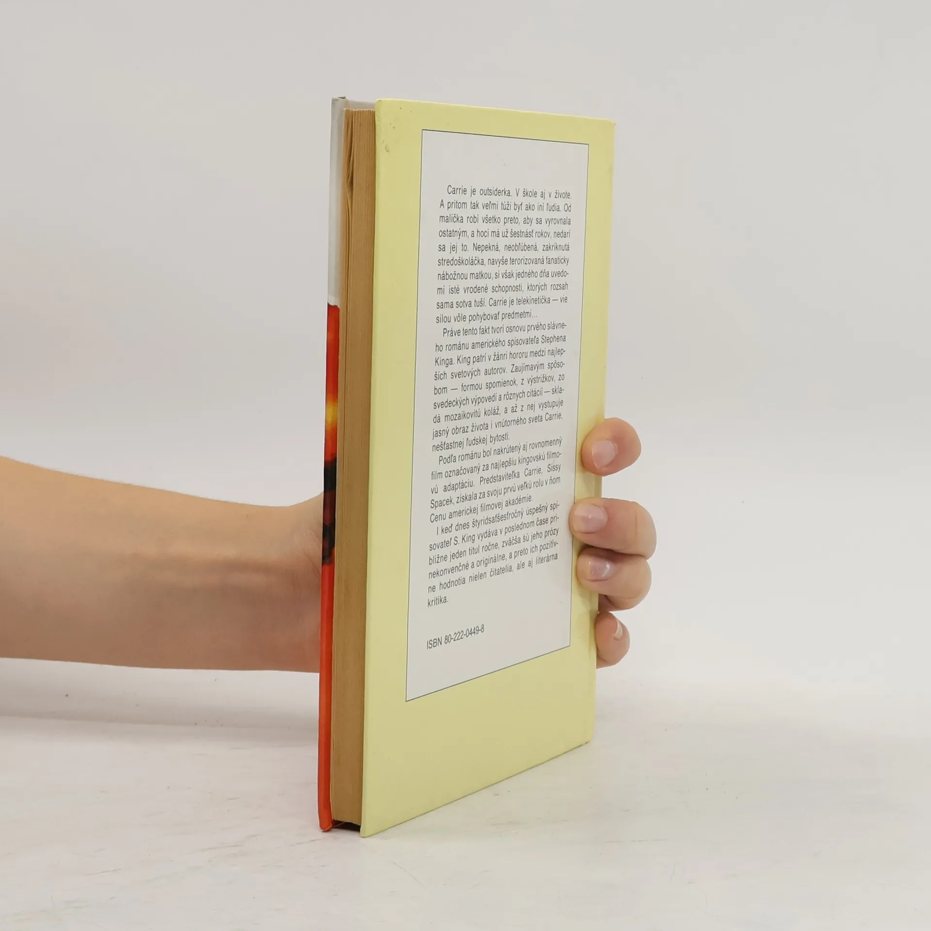 Sedemnásťročná Carrie je outsiderka v škole i v živote. Odmalička robí všetko pre to, aby sa vyrovnala ostatným, ale nedarí sa jej. Nepeknú, neobľúbenú, zakríknutú stredoškoláčku ešte aj doma priam terorizuje fanaticky nábožná matka. Carrie si však jedného dňa uvedomí svoje mimoriadne schopnosti, ktorých rozsah sama sotva tuší. Je telekinetička - silou vôle pohybuje predmetmi. A keď ju na školskom majálese opäť surovo ponížia, jej pomste nič nestojí v ceste. (oficiálny text vydavateľstva)