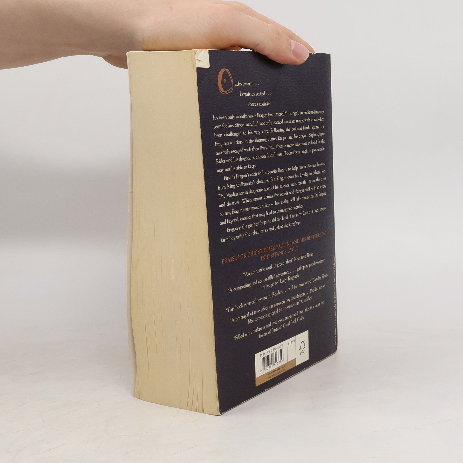 Oaths sworn . . . Loyalties tested . . . Forces collide. Eragon and his dragon, Saphira, have narrowly escaped with their lives after the colossal battle against the Empire's warriors on the Burning Plains. Now Eragon finds himself bound by promises he may not be able to keep. He must help rescue his cousin Roran's beloved from King Galbatorix's clutches. But he also owes his loyalty to the Varden, the elves and the dwarves, who are in desperate need of his talents and strength. Eragon in the greatest hope to rid the land of tyranny. Can this once simple farm boy unite the rebel forces and defeat the king?