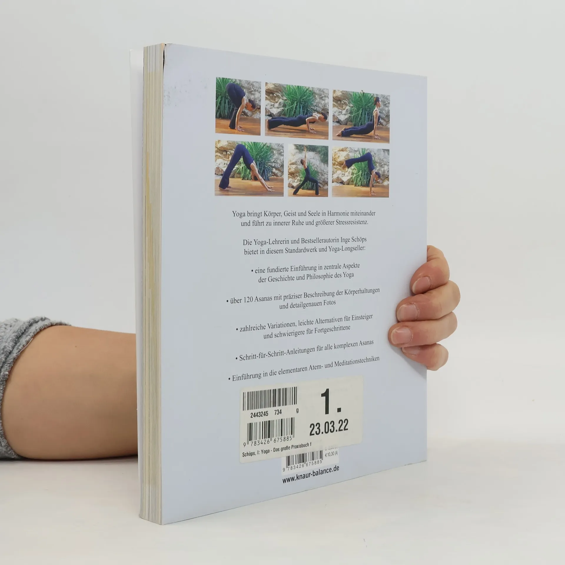 Das Buch von Inge Schöps ist ein umfassendes Yoga-Standardwerk für Einsteiger und Fortgeschrittene. Es bietet über 120 Asanas mit detaillierten Anleitungen und mehr als 700 Fotos. Zudem enthält es Atem- und Meditationstechniken sowie einen Überblick über die Yoga-Geschichte und -Philosophie. Ziel ist die Erlangung inneren Friedens und Unabhängigkeit.