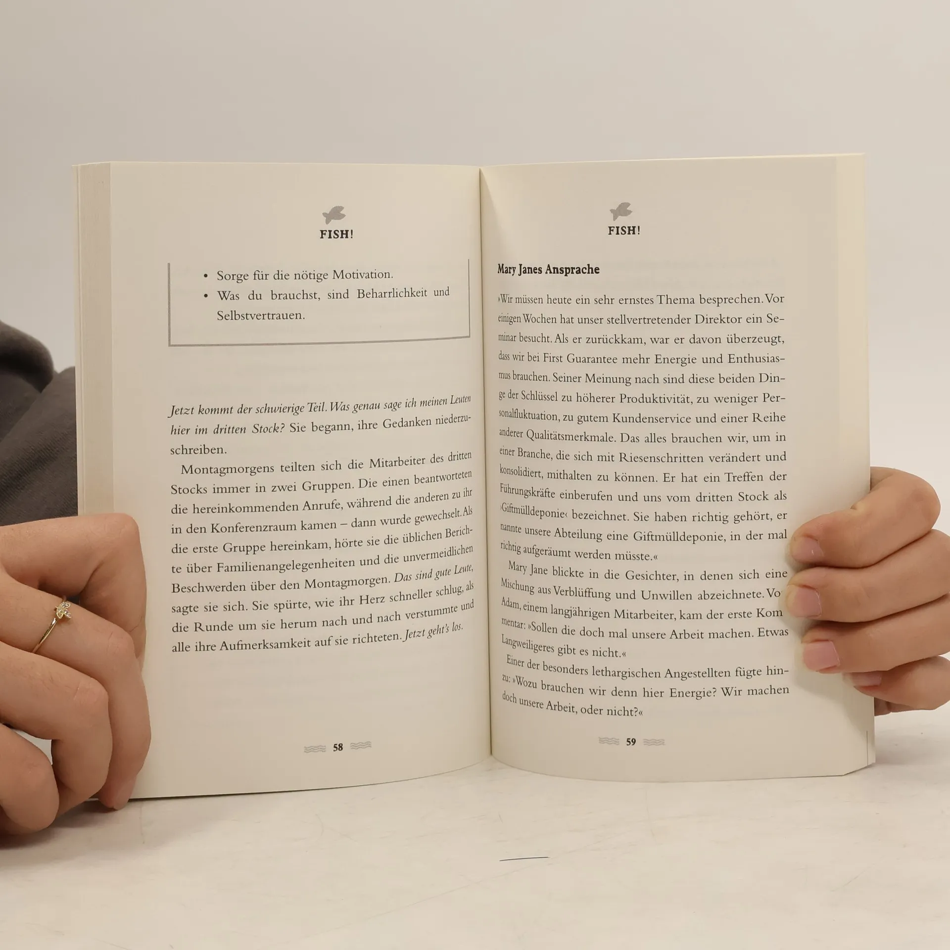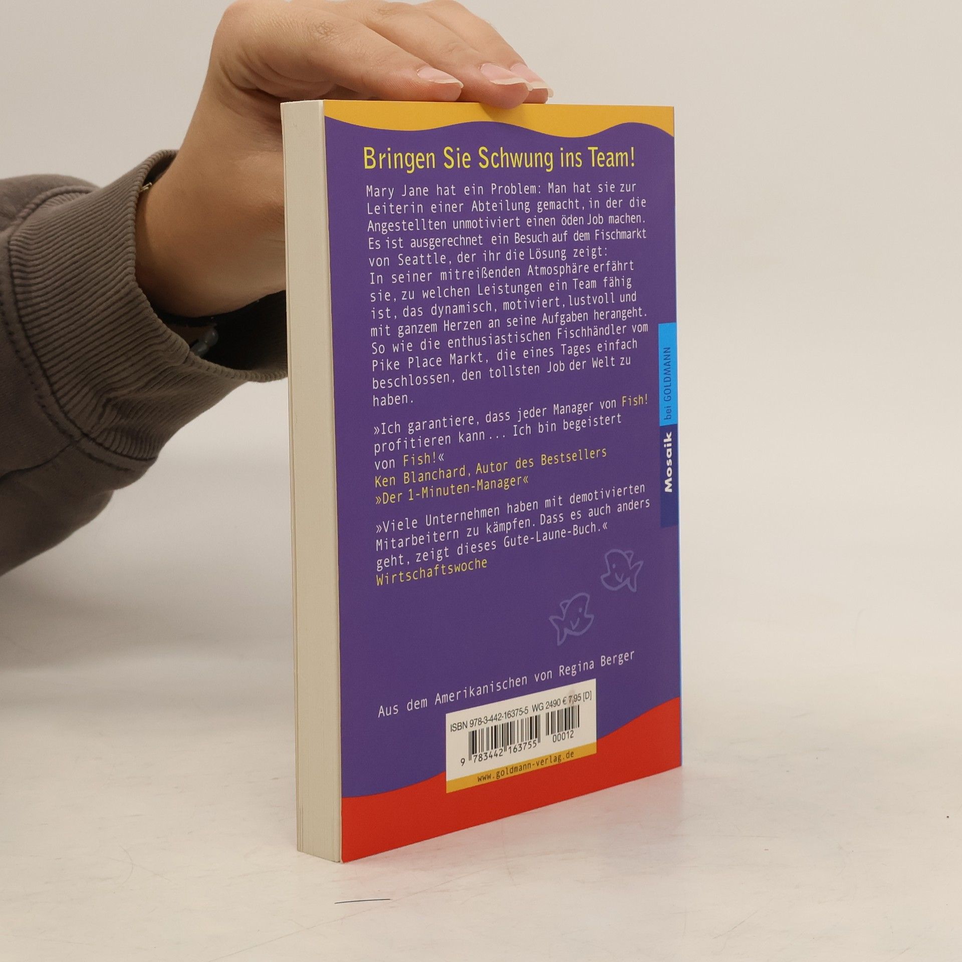 Mary Jane hat ein Problem: Man hat sie zur Leiterin einer Abteilung gemacht, in der die Angestellten unmotiviert einen öden Job machen. Es ist ausgerechnet ein Besuch auf dem Fischmarkt von Seattle, der ihr die Lösung zeigt: In seiner mitreißenden Atmosphäre erfährt sie, zu welchen Leistungen ein Team fähig ist, das dynamisch, motiviert, lustvoll und mit ganzem Herzen an seine Aufgaben herangeht. So wie die enthusiastischen Fischhändler vom Pike Place Markt, die eines Tages einfach beschlossen, den tollsten Job der Welt zu haben.