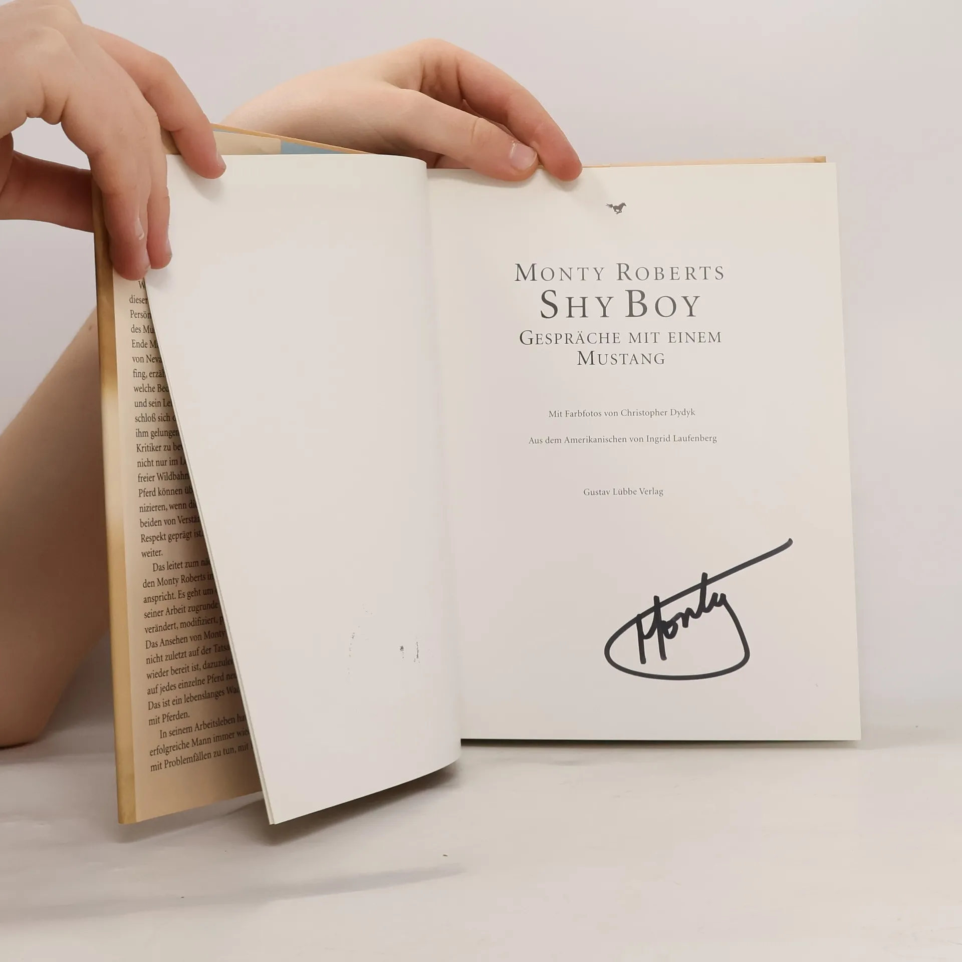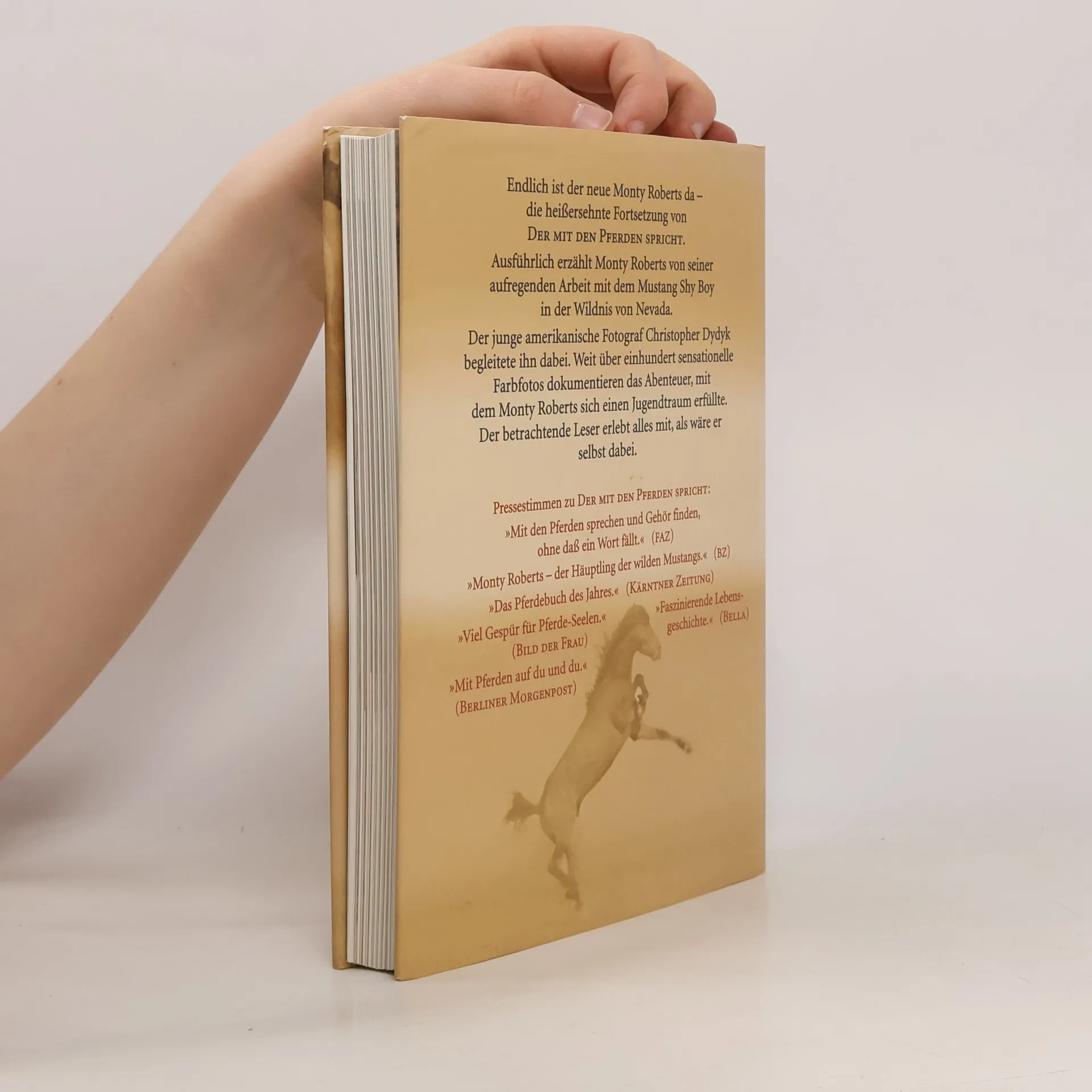 Shy Boy, Gespräche mit einem Mustang Die Fortsetzung des Bestsellers "Der mit den Pferden spricht". Der amerikanische Pferdeexperte Monty Roberts, bekannt für seine humane Methode des Umgangs mit Pferden, erzählt hier ausführlich von seiner Arbeit mit dem Mustang Shy Boy in der Wildnis von Nevada. Ein Filmteam der BBC und ein junger Fotograf begleiteten ihn. Rund 150 Farbfotos dokumentieren dieses Abenteuer. Am Beispiel des Mustangs Shy Boy, den Monty Roberts im Frühjahr 1997 in der Wildnis von Nevada nach seiner Join-up-Methode fing, erzählt er packend und anschaulich, welche Bedeutung dieses Ereignis für ihn und sein Lebenswerk hat. Begleitet wurde er von dem jungen amerikanischen Fotografen Christopher Dydyk: Weit über einhundert sensationelle Farbfotos dokumentieren das Abenteuer, mit dem Monty Roberts sich einen Jugendtraum erfüllte - und lassen den Leser stimmungsvoll an der Welt des Monty Roberts und der Philosophie, die seiner Arbeit zugrunde liegt, teilhaben.