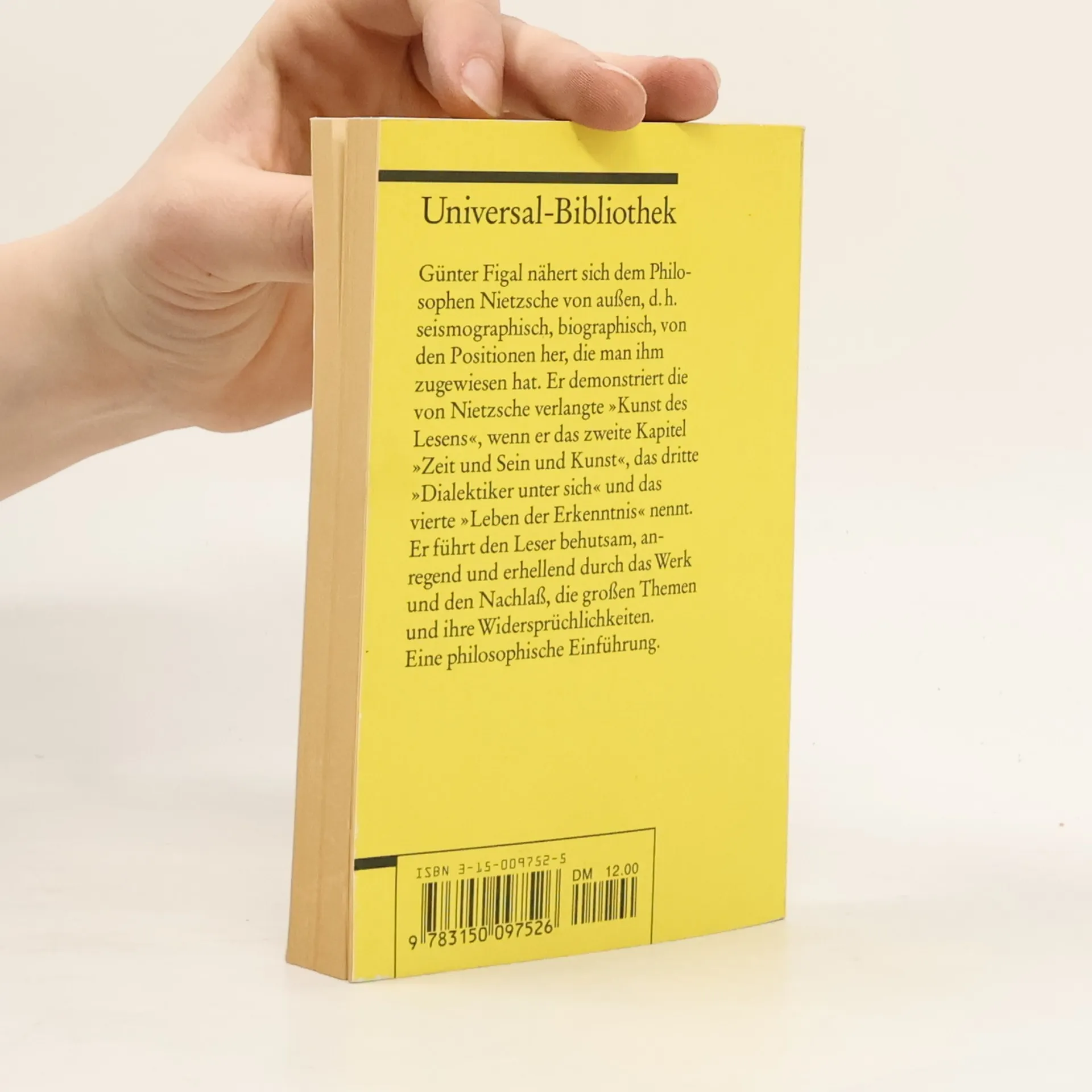 Günter Figal nähert sich dem Philosophen Nietzsche von außen, von seiner Biographie und von den Positionen her, die die Nachwelt ihm zugewiesen hat, um den Leser sodann behutsam, anregend und erhellend durch das Werk und den Nachlass zu führen, im Mittelpunkt immer Nietzsches Erfahrungen und Fragen, Gedanken und Bilder. Sein Buch ist eine Möglichkeit, ohne besondere Voraussetzungen mit Nietzsche bekannt zu werden.