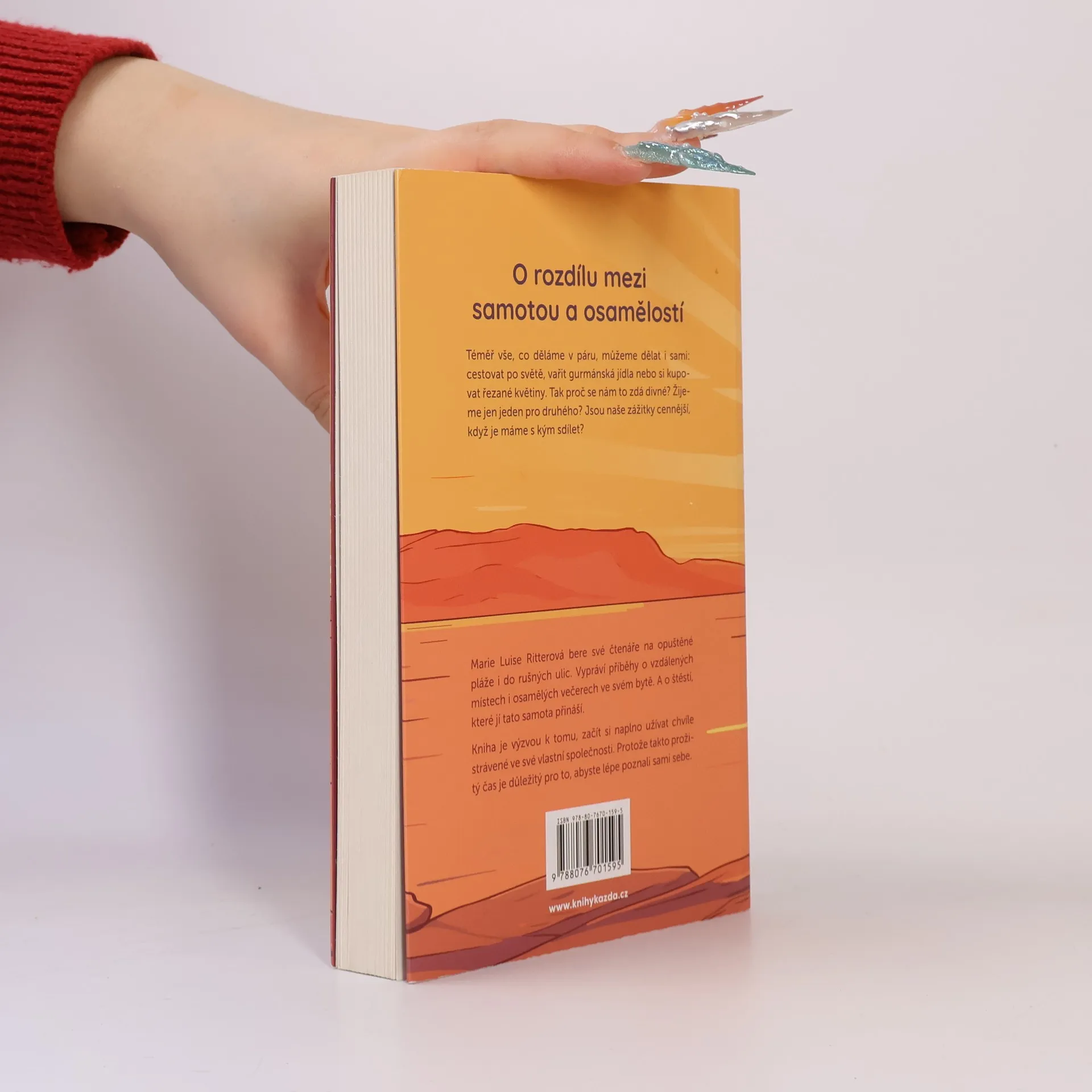 O rozdílu mezi samotou a osamělostí Téměř vše, co děláme v páru, můžeme dělat i sami: procestovat svět, vařit gurmánská jídla nebo si kupovat řezané květiny. Tak proč se nám to zdá divné? Žijeme jen jeden pro druhého? Nebo jsou naše zážitky cennější, když je máme s kým sdílet? Marie Luise Ritterová bere svého čtenáře na opuštěné pláže i do rušných ulic. Vypráví příběh o vzdálených místech i osamělých večerech ve svém bytě. A o štěstí, které jí tato samota přináší. Kniha je výzvou k tomu, abyste si začali naplno užívat chvíle strávené ve vlastní společnosti. Protože tento čas je důležitý k tomu, abyste lépe poznali sami sebe.