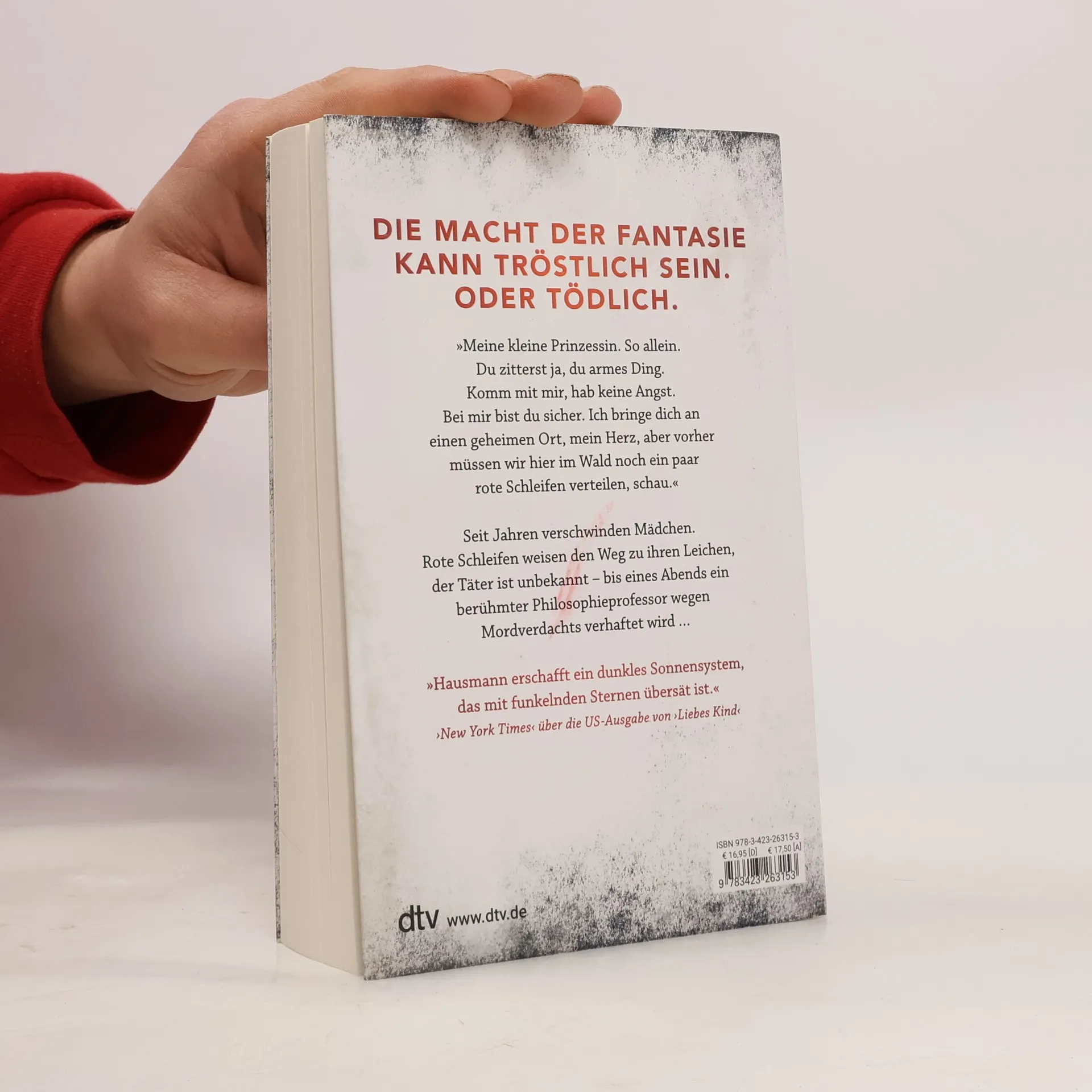 Die Macht der Gefühle kann tröstlich sein. Oder tödlich. Meine kleine Prinzessin. So allein. Du zitterst ja, du armes Ding. Komm mit mir, hab‘ keine Angst. Bei mir bist du sicher. Ich bringe dich an einen geheimen Ort, mein Herz, aber vorher müssen wir hier im Wald noch ein paar rote Schleifen verteilen, schau ... Seit vierzehn Jahren verschwinden Mädchen im Alter zwischen sechs und zehn Jahren. Rote Schleifenbänder weisen der Polizei den Weg zu ihren Leichen. Vom Täter fehlt seit vierzehn Jahren jede Spur. Eines Abends wird der international renommierte Philosophieprofessor und Anthropologe Walter Lesniak im Beisein seiner Tochter Ann verhaftet. Die Anklage: zehn Morde an jungen Mädchen. „Professor Tod“ titelt die Boulevardpresse. Doch Ann wird die Unschuld ihres Vaters beweisen. Für sie und die LeserInnen beginnt eine Reise in die dunkelsten Räume der menschlichen Seele … Von der Bestseller-Autorin Romy Hausmann sind weitere spannende Thriller bei dtv erschienen (»Liebes Kind«, »Marta schläft«) sowie das Sachbuch »TRUE CRIME. Der Abgrund in dir«.