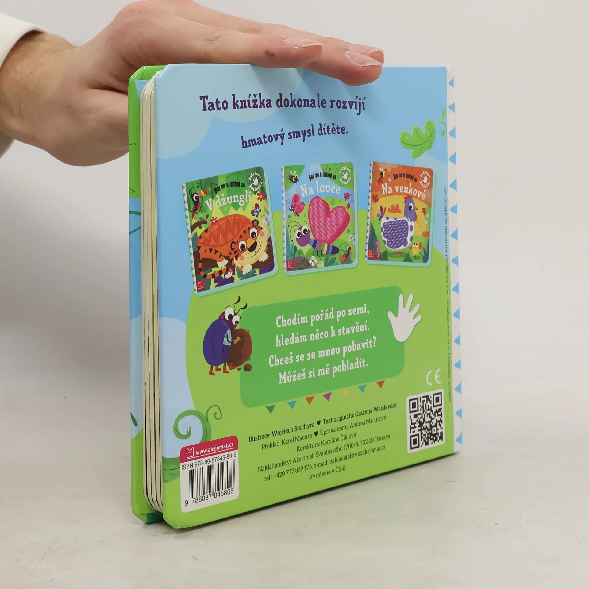 Kartónová knížka, jejíž obrázky jsou doplněny o dotykové plošky ze silikonu. Dokonale rozvíjí hmatový smysl dítěte.