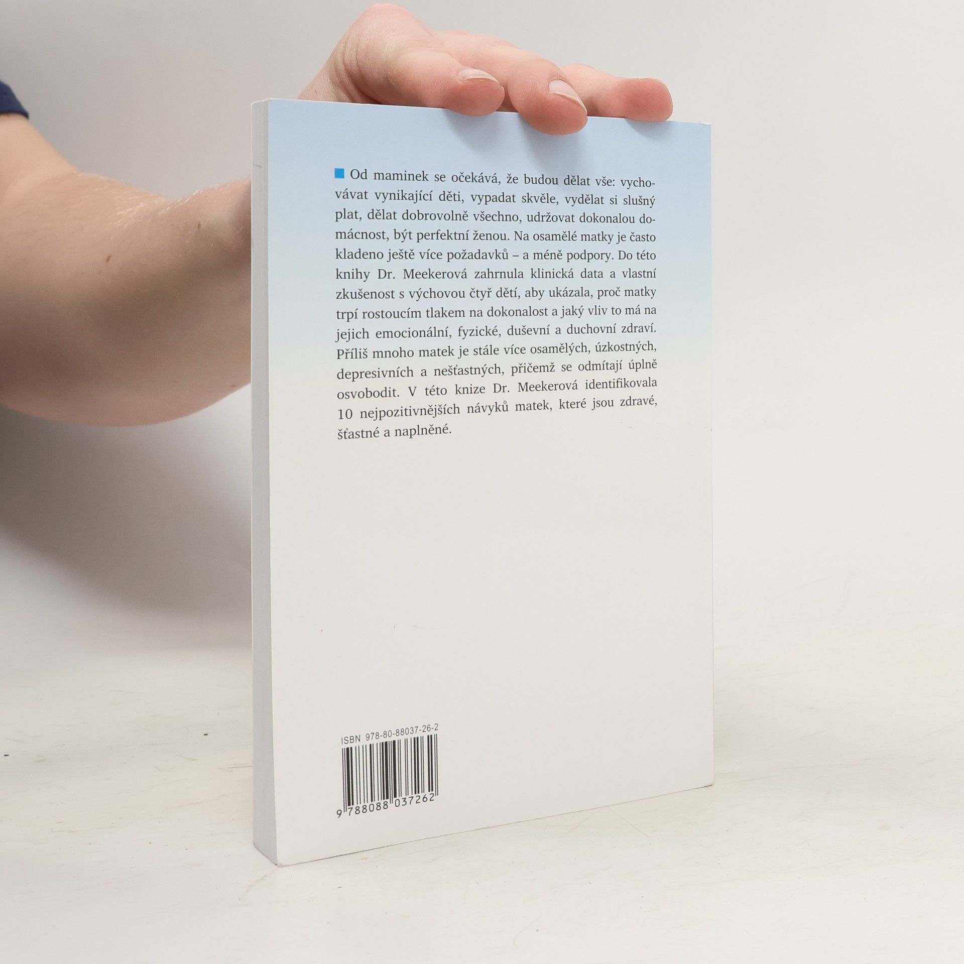 Od maminek se očekává, že budou dělat vše: vychovávat vynikající děti, vypadat skvěle, vydělat si slušný plat, dělat dobrovolně všechno, udržovat dokonalou domácnost, být perfektní ženou. Na osamělé matky je často kladeno ještě více požadavků - a méně podpory. Do této knihy Dr. Meekerová zahrnula klinická data a vlastní zkušenost s výchovou čtyř dětí, aby ukázala, proč matky trpí rostoucím tlakem na dokonalost a jaký vliv to má na jejich emocionální, fyzické, duševní a duchovní zdraví. Příliš mnoho matek je stále více osamělých, úzkostných, depresivních a nešťastných, přičemž se odmítají úplně osvobodit. V této knize Dr. Meekerová identifikovala 10 nejpozitivnějších návyků matek, které jsou zdravé, šťastné a naplněné.