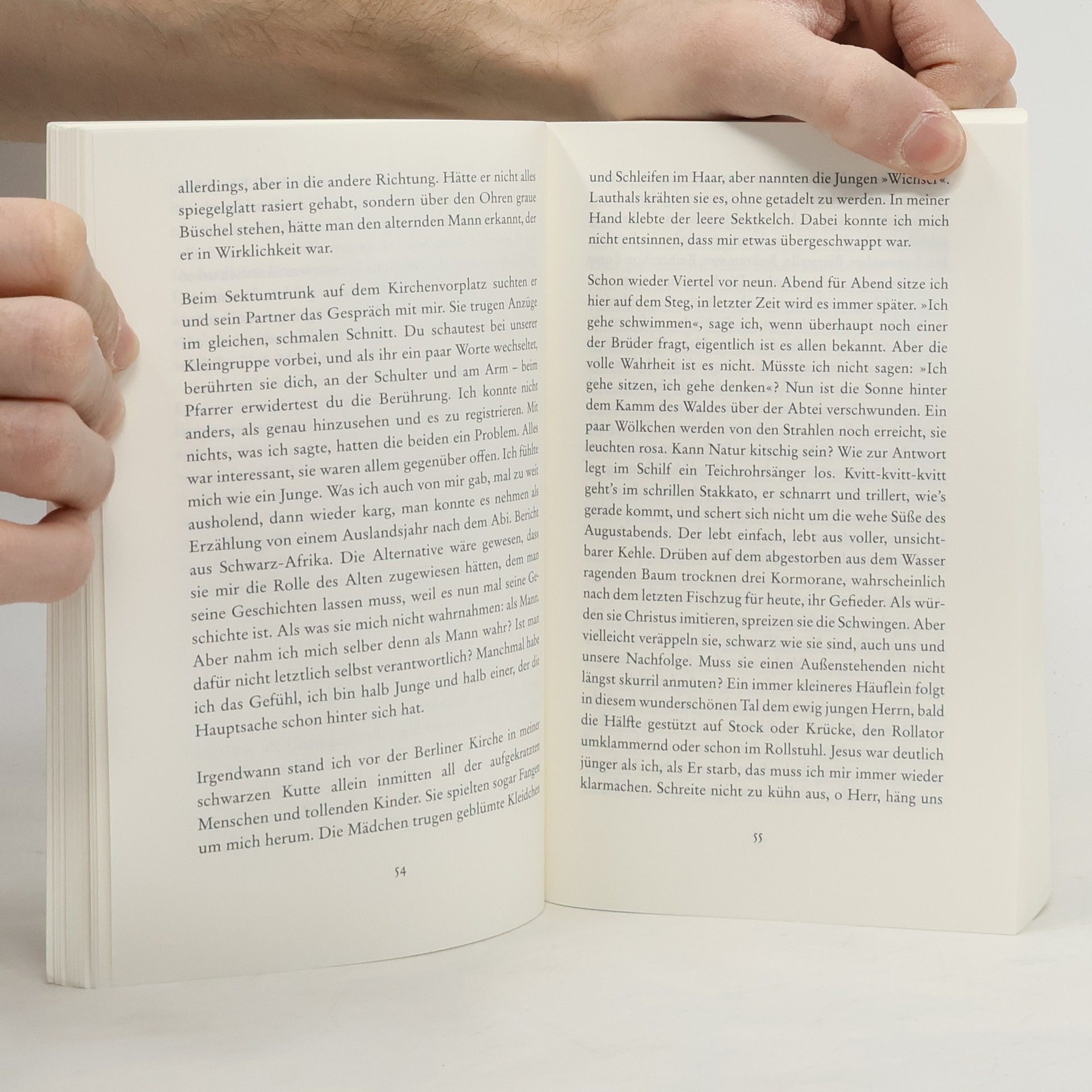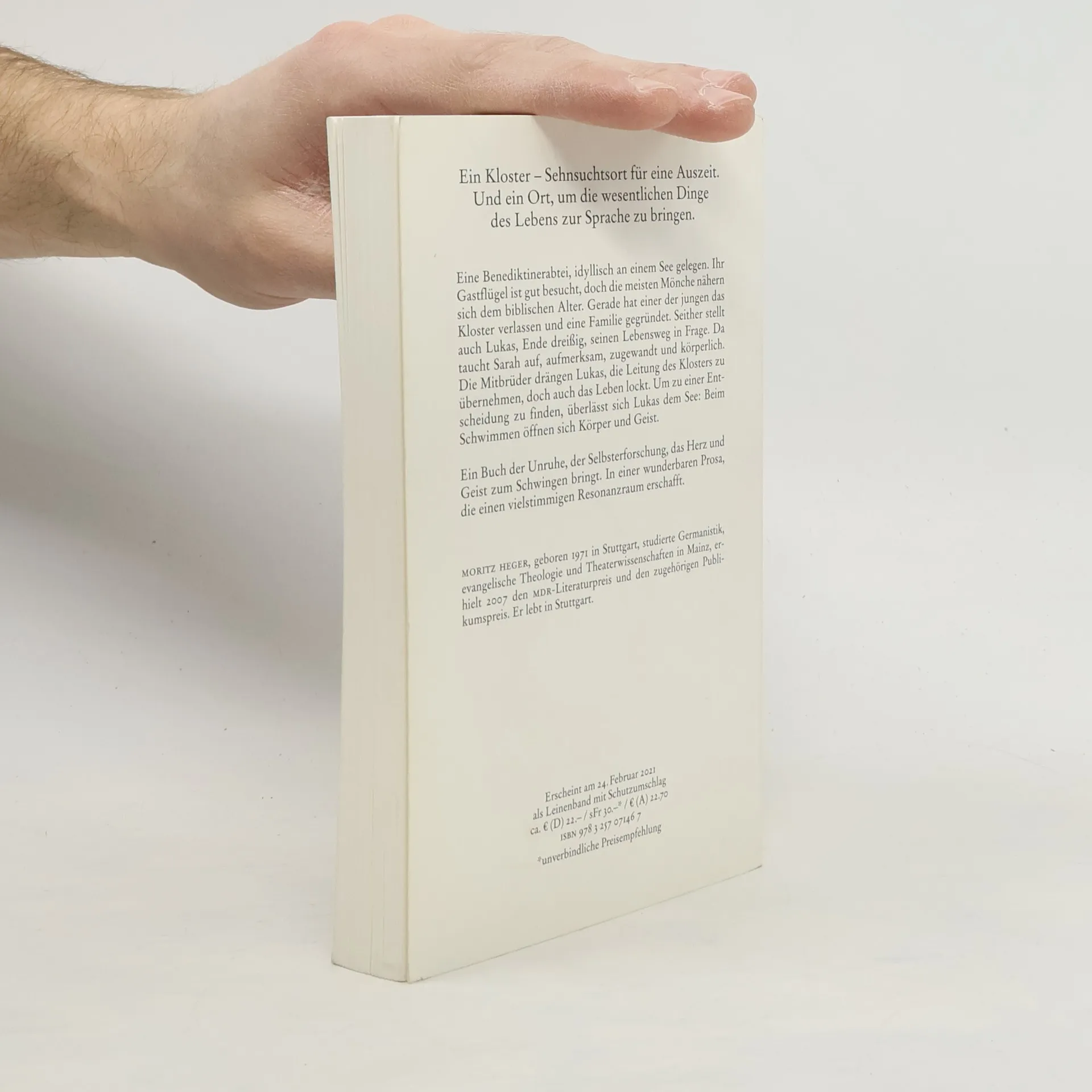 Eine Benediktinerabtei, idyllisch an einem See gelegen. Ihr Gastflügel ist gut besucht, doch die meisten Mönche nähern sich dem biblischen Alter. Gerade hat einer der jungen das Kloster verlassen und eine Familie gegründet. Seither stellt auch Lukas, Ende dreißig, seinen Lebensweg infrage. Da taucht Sarah auf, aufmerksam, zugewandt und körperlich. Um zu einer Entscheidung zu finden, überlässt sich Lukas dem See: Beim Schwimmen öffnen sich Körper und Geist.