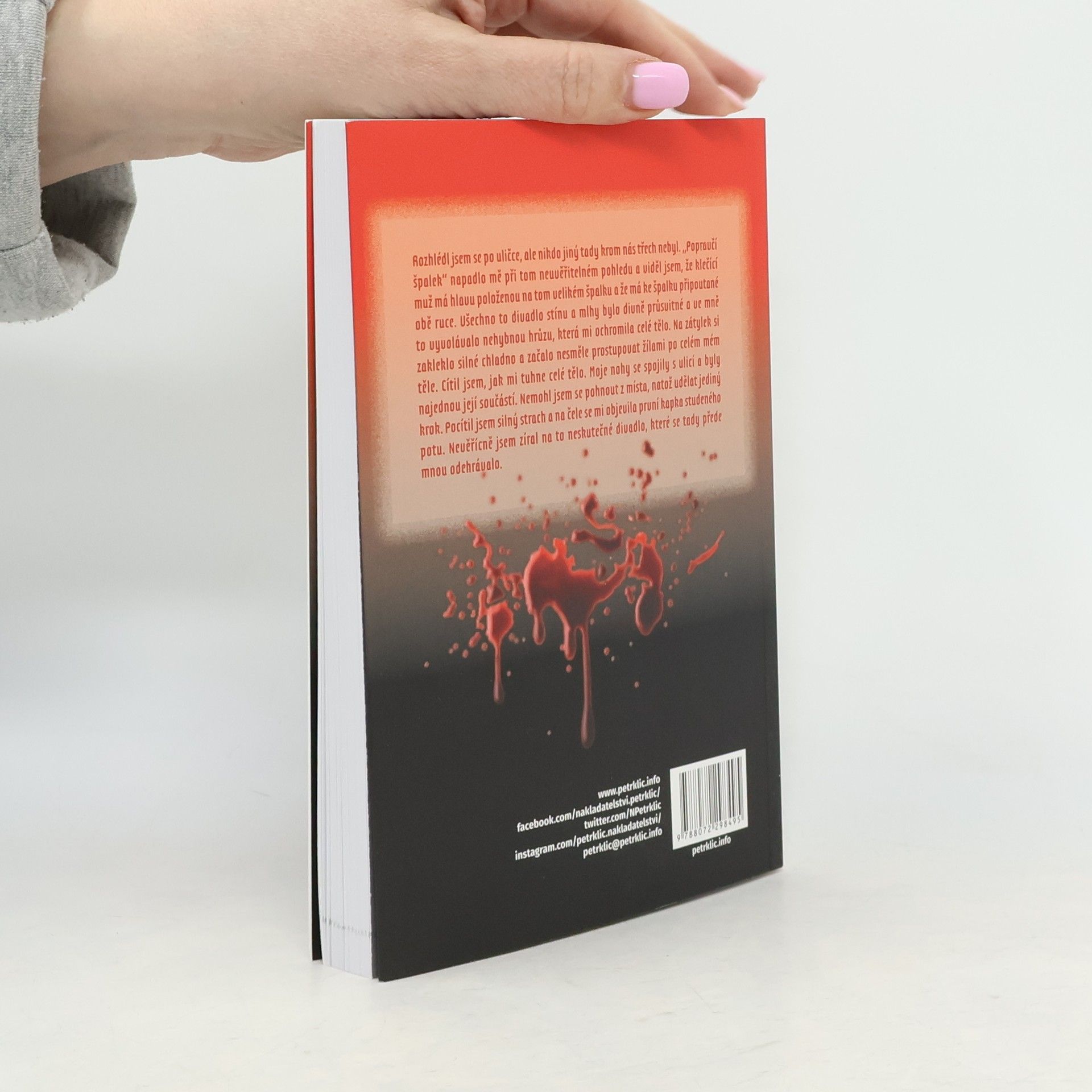 Rozhlédl jsem se po uličce, ale nikdo jiný tady krom nás třech nebyl. „Popravčí špalek“ napadlo mě při tom neuvěřitelném pohledu a viděl jsem, že klečící muž má hlavu položenou na tom velikém špalku a že má ke špalku připoutané obě ruce. Všechno to divadlo stínu a mlhy bylo divně průsvitné a ve mně to vyvolávalo nehybnou hrůzu, která mi ochromila celé tělo. Na zátylek si zakleklo silné chladno a začalo nesměle prostupovat žílami po celém mém těle. Cítil jsem, jak mi tuhne celé tělo. Moje nohy se spojily s ulicí a byly najednou její součástí. Nemohl jsem se pohnout z místa, natož udělat jediný krok. Pocítil jsem silný strach a na čele se mi objevila první kapka studeného potu. Nevěřícně jsem zíral na to neskutečné divadlo, které se tady přede mnou odehrávalo.