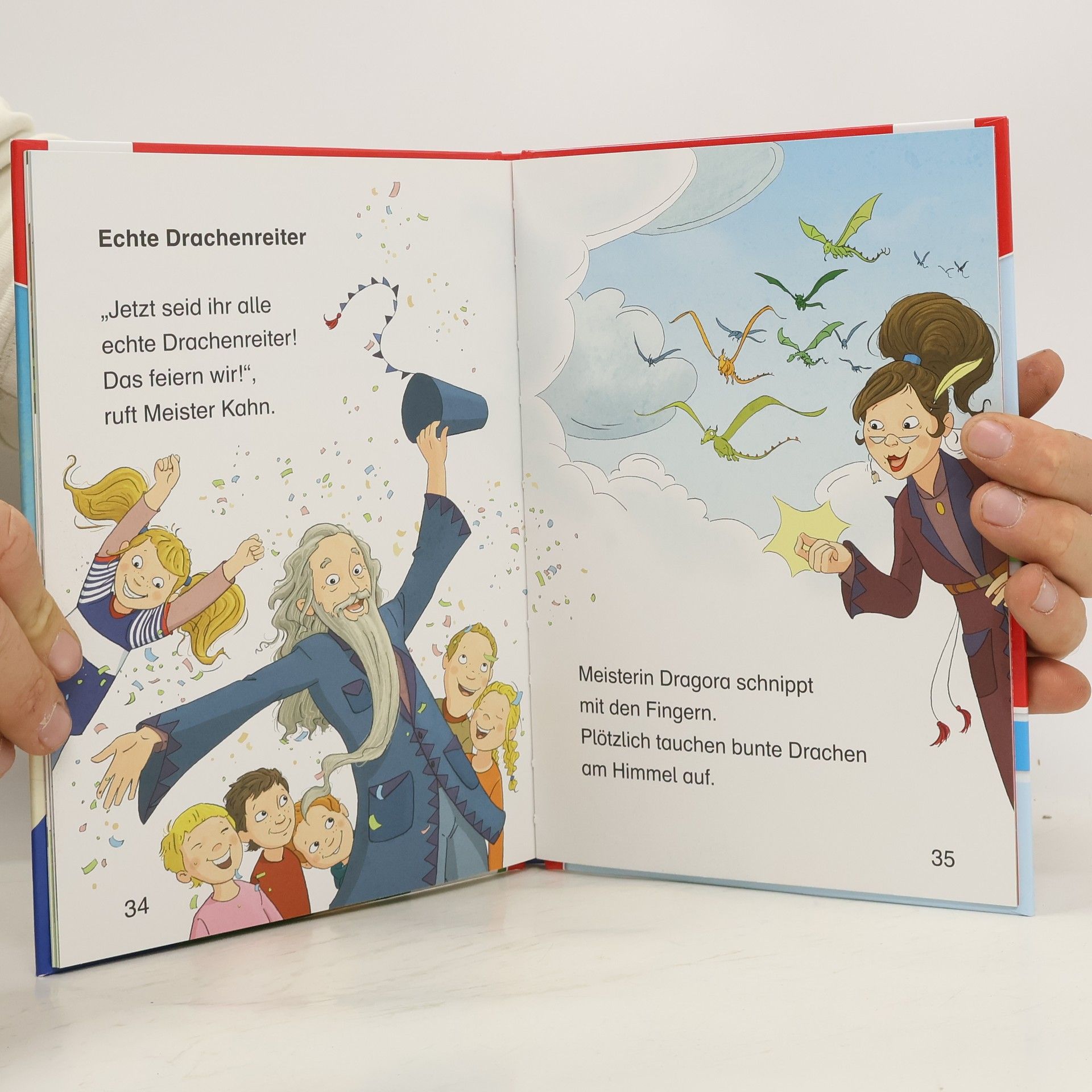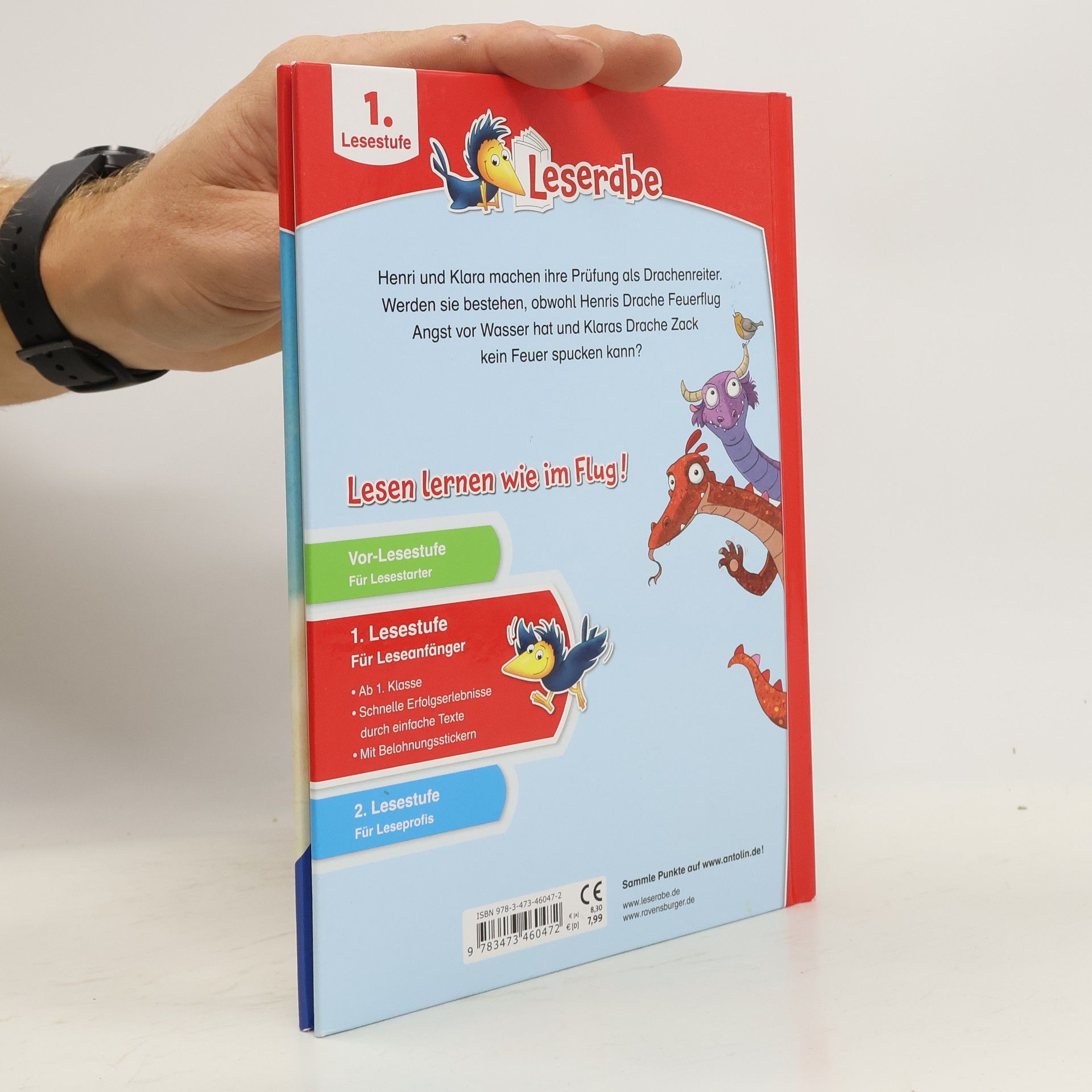 Henri und Klara machen ihre Prüfung als Drachenreiter. Werden sie bestehen, obwohl Henris Drache Feuerflug Angst vor Wasser hat und Klaras Drache Zack kein Feuer spucken kann? Lesen lernen wie im Flug! Die Kinderbücher der Reihe Leserabe – 1. Lesestufe wurden mit Pädagogen entwickelt und richten sich an Leseanfänger ab der 1. Klasse. Kurze Texte in großer Fibelschrift sichern erste Leseerfolge und steigern die Lesekompetenz von Mädchen und Jungen ab 6 Jahren. Mit Belohnungsstickern. Empfohlen von Stiftung Lesen, gelistet bei Antolin. Weitere Informationen auf leserabe. de. Henri und Klara machen heute ihre Abschlussprüfungen als Drachenreiter. Sie müssen im Dunkeln durch einen Wald fliegen, ohne einen Baum zu berühren. Henris Drache Feuerflug schafft das sehr gut, muss aber plötzlich ausweichen, als er von einem anderen Drachen überholt wird. Alle Schüler bestehen die Prüfung! Die zweite Prüfung findet am See statt: Die Drachen müssen allein ins Wasser springen. Feuerflug hasst Schwimmen. Als er an der Reihe ist, bleibt er einfach am Ufer stehen. Die anderen Drachen werden schon ungeduldig, da stolpert Zack und reißt Feuerflug mit sich in den kalten See – geschafft! Die dritte Prüfung ist ein Kinderspiel für Feuerflug – mit einem Atemzug stößt er eine große Flamme aus und bringt seinen Holzstapel zum Brennen. Henri und Klara bestehen ihre Drachenreiter-Prüfung!