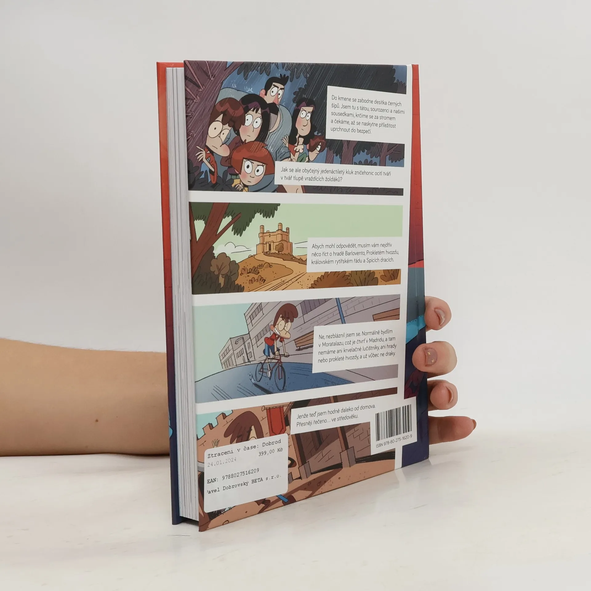 Druhé dobrodružství Sebastiána Balbueny. Do kmene se zabodne desítka černých šípů. Jsem tu s tátou, sourozenci a našimi sousedkami, krčíme se za stromem a čekáme, až se naskytne příležitost uprchnout do bezpečí. Jak jsem se ale já, obyčejný jedenáctiletý kluk, ocitl tváří v tvář tlupě vraždících žoldáků? Abych mohl odpovědět, musím vám nejdřív něco povědět o hradě Barlovento, Prokletém hvozdu, královském rytířském řádu a Spících dracích. Ne, nezbláznil jsem se. Jmenuju se Sebastián a normálně bydlím v Moratalazu, což je čtvrť v Madridu, a tam nemáme ani krvelačné lučištníky, ani hrady nebo prokleté hvozdy, a už vůbec ne draky. Jenže teď jsem hodně daleko od domova. Přesněji řečeno ve středověku. Ztraceni v čase je nová série autorů oblíbených Fotbaláků. Seznámíte se v ní s bláznivou rodinkou, která se shodou nevyzpytatelných okolností zacyklí v čase a prostoru. První díl, Dobrodružství rodiny Balbuenových na Divokém západě, vyšel česky v roce 2022.