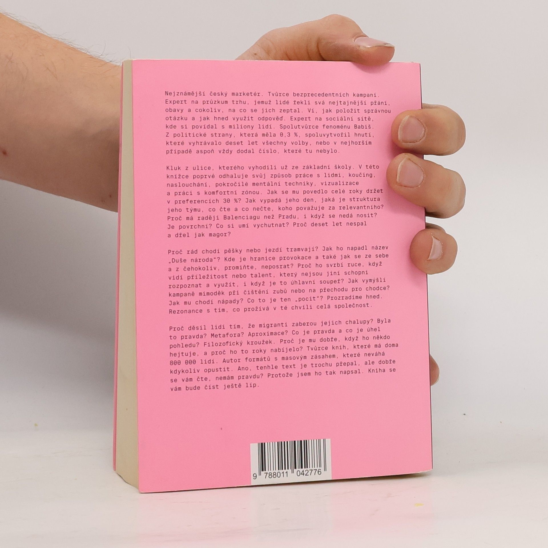 Nejznámější český marketér. Tvůrce bezprecedentních kampaní. Expert na průzkum trhu, jemuž lidé řekli svá nejtajnější přání, obavy a cokoliv, na co se jich zeptal. Ví, jak položit správnou otázku a jak hned využít odpověď. Expert na sociální sítě, kde si povídal s miliony lidí. Spolutvůrce fenoménu Babiš. Z politické strany, která měla 0,3 %, spoluvytvořil hnutí, které vyhrávalo deset let všechny volby, nebo v nejhorším případě aspoň vždy dodal číslo, které tu nebylo. Kluk z ulice, kterého vyhodili už ze základní školy. V této knížce poprvé odhaluje svůj způsob práce s lidmi, koučing, naslouchání, pokročilé mentální techniky, vizualizace a práci s komfortní zónou. Jak se mu povedlo celé roky držet v preferencích 30 %? Jak vypadá jeho den, jaká je struktura jeho týmu, co čte a co nečte, koho považuje za relevantního? Proč má raději Balenciagu než Pradu, i když se nedá nosit? Je povrchní? Co si umí vychutnat? Proč deset let nespal a dřel jak magor? Proč rád chodí pěšky nebo jezdí tramvají? Jak ho napadl název „Duše národa“? Kde je hranice provokace a také jak se ze sebe a z čehokoliv, promiňte, neposrat? Proč ho svrbí ruce, když vidí příležitost nebo talent, který nejsou jiní schopni rozpoznat a využít, i když je to úhlavní soupeř? Jak vymýšlí kampaně mimoděk při čištění zubů nebo na přechodu pro chodce? Jak mu chodí nápady? Co to je ten „pocit“? Prozradíme hned. Rezonance s tím, co prožívá v té chvíli celá společnost. Proč děsil lidi tím, že migranti zaberou jejich chalupy? Byla to pravda? Metafora? Aproximace? Co je pravda a co je úhel pohledu? Filozofický kroužek. Proč je mu dobře, když ho někdo hejtuje, a proč ho to roky nabíjelo? Tvůrce knih, které má doma 800 000 lidí. Autor formátů s masovým zásahem, které neváhá kdykoliv opustit. Ano, tenhle text je trochu přepal, ale dobře se vám čte, nemám pravdu? Protože jsem ho tak napsal. Kniha se vám bude číst ještě líp.