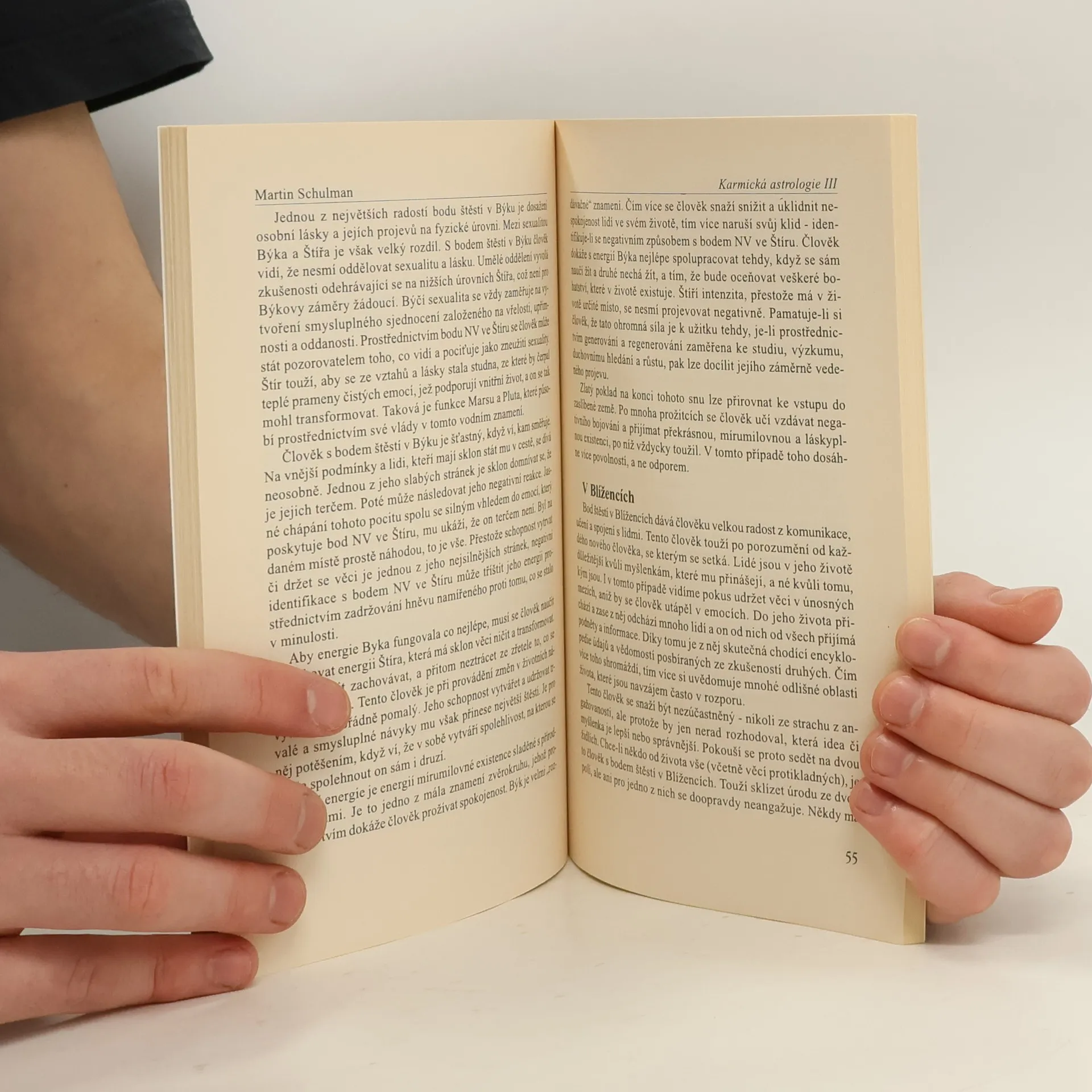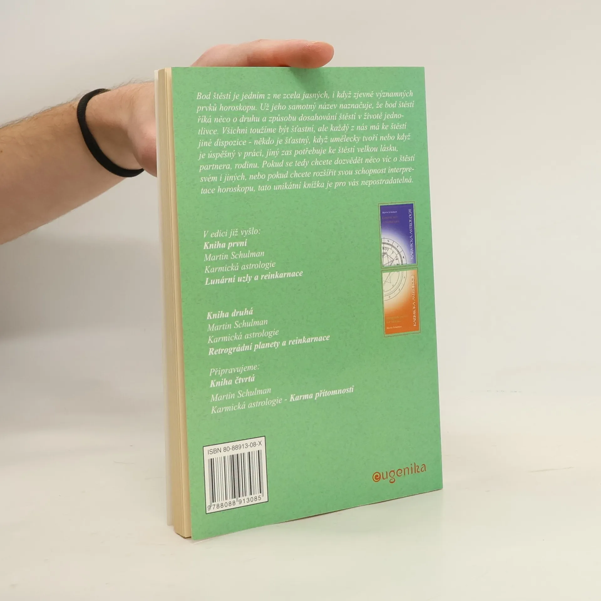 Martin Schulman je jedním z nejpozoruhodnějších astrologů současnosti. Vlivy či vlastnosti naznačené jednotlivými prvky horoskopu chápe jako potenciál, jehož cílem není nic menšího než dovést jedince k osvícení, naplnění poslání a vyčištění karmy. Severní lunární uzel určujě směr nového vývoje. Dům a znamení, kde se nachází, odhalují, co by měl člověk v tomto životě rozvíjet. Jižní lunární uzel naopak znamená, nač je zvyklý a čeho se nechce vzdát, čeho se však vzdát musí ve prospěch opačného přístupu, symbolizovaného uzlem severním. Když je planeta retrográdní, má to zvláštní význam. Každá je podrobně analyzovaná ve všech znameních i domech: co symbolizuje, jak utváří osobnost a jakou karmu představuje. Velmi důležitý je bod štěstí. Podrobně se zde vysvětluje jeho význam nejprve ve všeobecnosti a potom konkrétně podle postavení v horoskopu v domech a znameních; rovněž analyzuje jeho aspekty. Karma přítomnosti představuje zvláštní výklad všech planet: podle toho, jak nás motivují k pozitivnímu vnímání a jednání; k tomu, abychom naplnili své potřeby a zaujali své místo ve světě s plnou odpovědností za svůj život.
