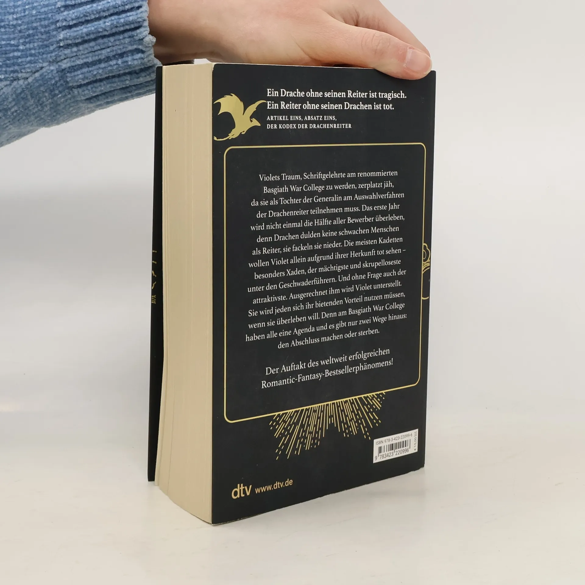 Ein Drache ohne seinen Reiter ist tragisch. Ein Reiter ohne seinen Drachen ist tot.Violets Traum, Schriftgelehrte am renommierten Basgiath War College zu werden, zerplatzt jäh, da sie als Tochter der Generalin am Auswahlverfahren der Drachenreiter teilnehmen muss. Das erste Jahr wird nicht einmal die Hälfte aller Bewerber überleben, denn Drachen binden sich nicht an schwache Menschen, sie fackeln sie nieder. Die meisten Kadetten wollen Violet allein aufgrund ihrer Herkunft niederstrecken – besonders Xaden, der mächtigste und skrupelloseste unter den Geschwaderführern. Und ohne Frage auch der attraktivste. Ausgerechnet ihm wird Violet unterstellt. Sie wird jeden Vorteil nutzen müssen, wenn sie überleben will. Denn am Basgiath War College haben alle eine Agenda und es gibt nur zwei Wege hinaus: den Abschluss machen oder sterben.
