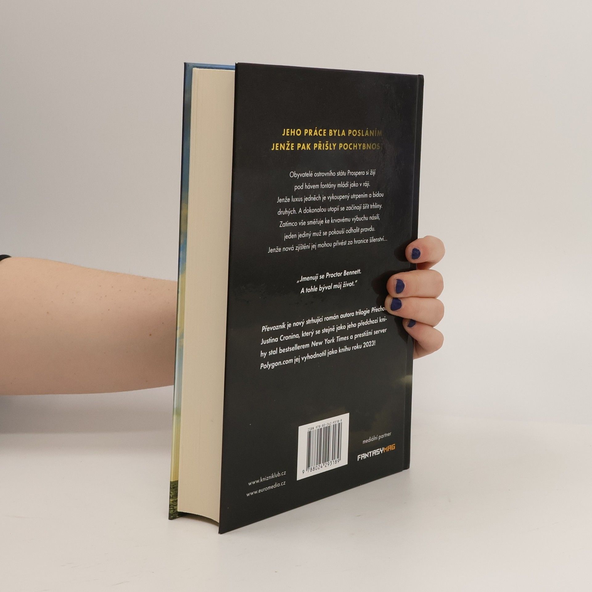 Od autora bestselleru New York Times Přechod přichází strhující nový román o skupině přeživších na skryté ostrovní utopii – kde pravda není taková, jak se zdá. Souostroví Prospera, založené tajemným géniem, leží skryto před hrůzami zhoršujícího se vnějšího světa. Šťastlivci si zde užívají dlouhé, plnohodnotné životy, dokud monitory zapuštěné v jejich předloktí, které mají měřit jejich fyzické zdraví a psychickou pohodu, neklesnou pod 10 procent. Poté se sami odeberou do důchodu a vydají se na plavbu trajektem na ostrov známý jako Rodiště, kde se jejich selhávající těla obnoví, vzpomínky jsou vymazány a oni jsou připraveni znovu začít žít naplno. Proctor Bennett je převozník, který ohleduplně provází lidi procesem odchodu do důchodu – a když je to nutné, donutí je k tomu. Ale s Proctorem není všechno v pořádku. Za prvé, snil – což je údajně nemožné. Za druhé, jeho procento monitorů začalo znepokojivě rychle klesat. A pak přijde den, kdy je povolán do důchodu jeho vlastní otec, který mu před nástupem na trajekt předá znepokojivou a záhadnou zprávu...