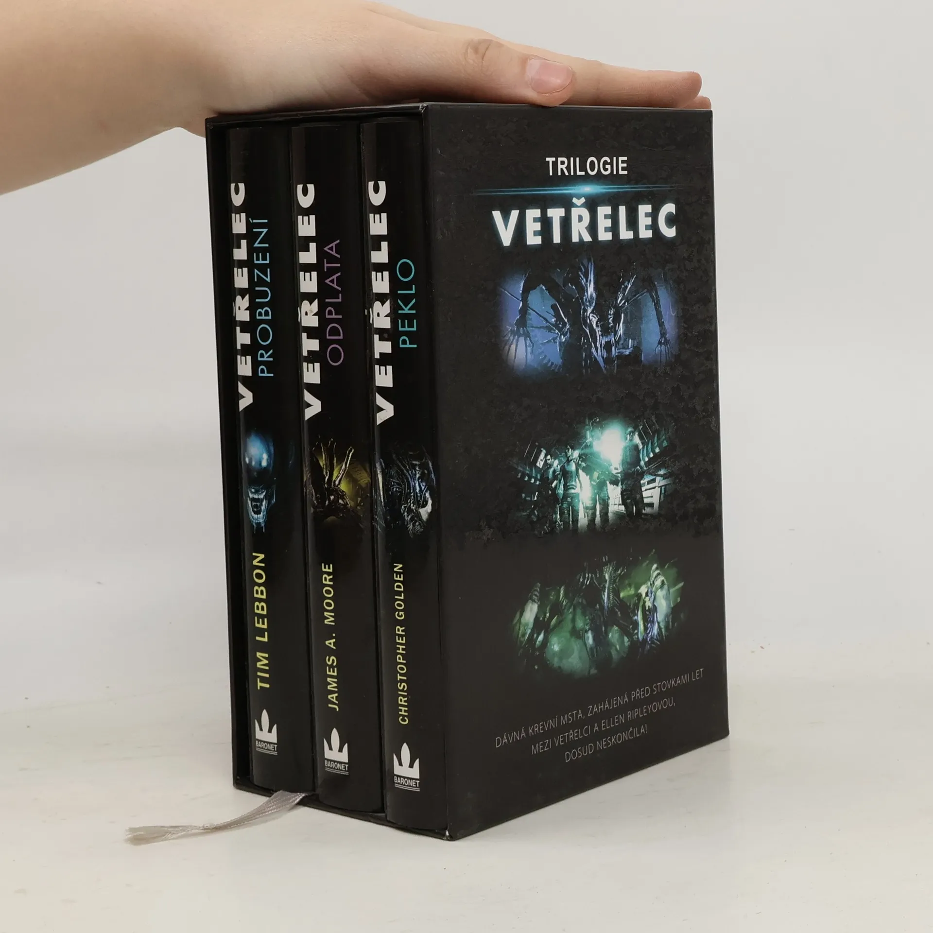Box obsahuje následující tituly: Tim Lebbon: Vetřelec - Probuzení. V roce 2159, po vítězství Ellen Ripleyové nad vetřelcem, stále pluje v hibernačním spánku. Během těžby vzácného minerálu na planetě LV178 se objevují záhadní tvorové, a zlo se probouzí. Hlavní inženýr Chris Hooper a jeho posádka čelí zkáze, a jejich poslední nadějí je nouzový signál zachycený Elleniným záchranným modulem. Román je prvním dílem trilogie spojené s kultovní sci-fi ságou o vetřelcích. James A. Moore: Vetřelec - Odplata. Alan Decker dohlíží na terraformaci planety LV178, nyní známé jako Nový Galveston. Pod jejím povrchem se skrývá živý vetřelec a tajemství společnosti Weyland-Yutani. Decker se postupně dozvídá, že má s těmito nebezpečnými tvory osobní spojení, a krvavá msta mezi vetřelci a Ellen Ripleyovou stále pokračuje. Tento román je druhým dílem trilogie. Christopher Golden: Vetřelec - Peklo. Ellen Ripleyová pluje ve svém záchranném modulu a planeta LV-426 byla terraformována a osídlena. Kolonizátoři hledají nový život, ale na planetě se začínají dít podivné věci. Po sedmapadesáti letech bloudění se Ellen konečně dostává k záchraně, ale Weyland-Yutani ji potřebuje, protože na LV-426 se stalo něco závažného. Tento román je třetím dílem trilogie.