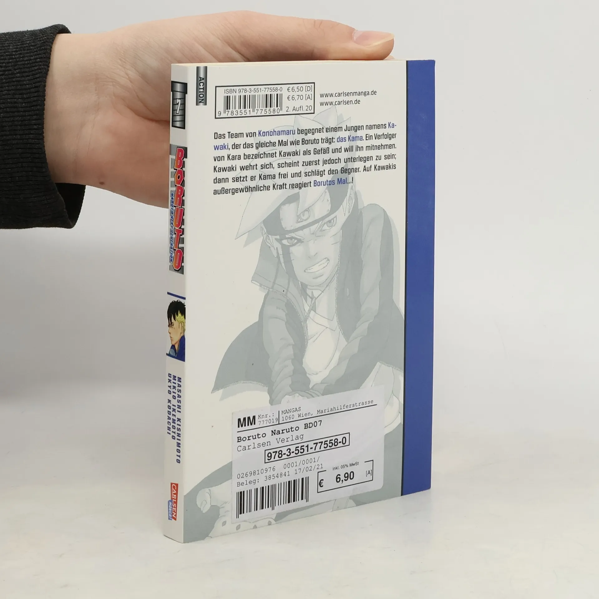Die Ninja-Abenteuer gehen in die nächste Runde! Das Team von Konohamaru begegnet einem Jungen namens Kawaki, der das gleiche Mal wie Boruto trägt: das Kama. Ein Verfolger von Kara bezeichnet Kawaki als Gefäß und will ihn mitnehmen. Kawaki wehrt sich, scheint zuerst jedoch unterlegen zu sein; dann setzt er Kama frei und schlägt den Gegner. Auf Kawakis außergewöhnliche Kraft reagiert Borutos Mal…! Der Spin-off-Manga zum Mega-Bestseller aus Japan! Perfekt für Fans von »Dragon Ball«, »Samurai8« und »Seven Deadly Sins«! Weitere Infos: - empfohlen ab 10 Jahren - Anime-Stream u. a. auf Crunchyroll - Anime-DVD/Blu-ray von KSM Anime - Abgeschlossen in 20 Bänden, die Geschichte wird in „Boruto - Two Blue Vortex“ fortgesetzt