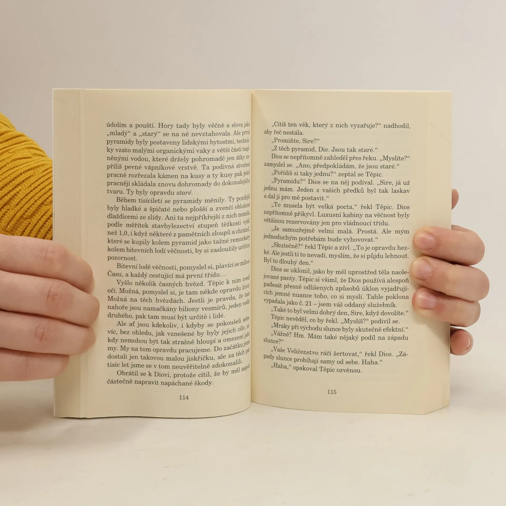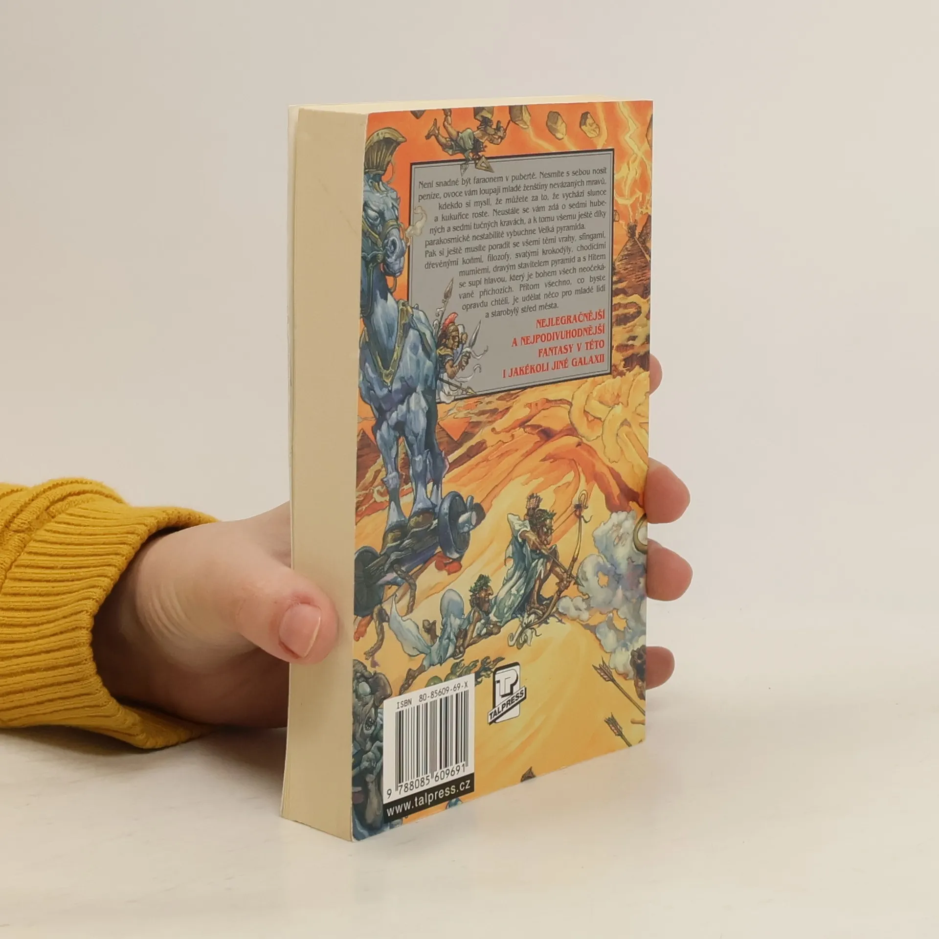 Není snadné být faraónem v pubertě. Nesmíte s sebou nosit peníze, ovoce vám loupají mladé ženštiny nevázaných mravů, kdekdo si myslí, že můžete za to, že vychází slunce a kukuřice roste. Neustále se vám zdá o sedmi hubených a sedmi tučných krávách, a k tomu všemu ještě díky parakosmické nestabilitě vybuchne Velká pyramida. Pak si ještě musíte poradit se všemi těmi vrahy, sfingami, dřevěnými koňmi, filozofy, svatými krokodýly, chodícími mumiemi, dravým stavitelem pyramid a s Hitem se supí hlavou, který je bohem všech neočekávané příchozích. Přitom všechno, co byste opravdu chtěli, je udělat něco pro mladé lidi a starobylý střed města.... celý text