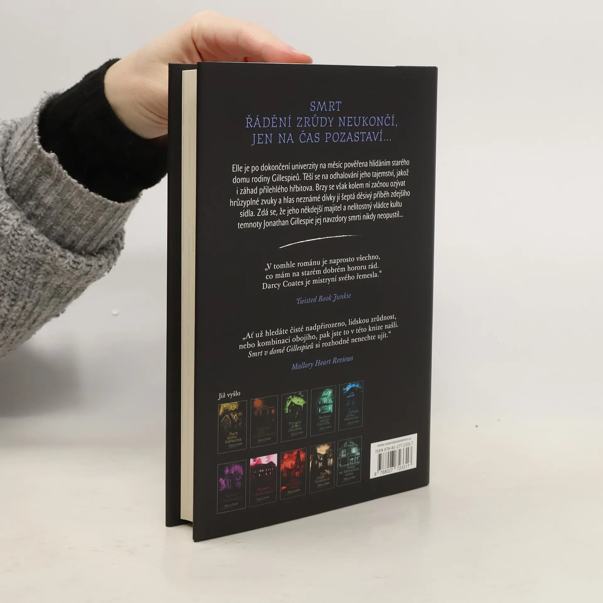Elle právě dokončila univerzitu a nemůže uvěřit svému štěstí, když po náročném období posledních zkoušek dostane příležitost strávit celý měsíc hlídáním nádherné, starobylé usedlosti rodiny Gillespieových. Dvě staletí stará rezidence je vzdálená více než hodinu jízdy od města a je obklopená hustými lesy. Elle se těší, až prozkoumá všechna tajemství, která takový dům jistě ukrývá. Za domem se dokonce nachází hřbitov s náhrobky, na kterých je stejný rok úmrtí. Temná a smrtící historie domu se začíná rychle proplétat s Elleiným vlastním životem. Zjistí, že dům postavil Jonathan Gillespie, tyranský vůdce kultu Temnoty. Ten je sice dávno mrtvý, ale jak Elle záhy zjistí, je docela možné, že se doposud ukrývá v temných zákoutích domu. A čeká na svoji pomstu. Povídka „Smrt v domě Gillespieů“ je jedním ze čtyř strašidelných příběhů ve stejnojmenné knize královny hororů Darcy Coatesové.