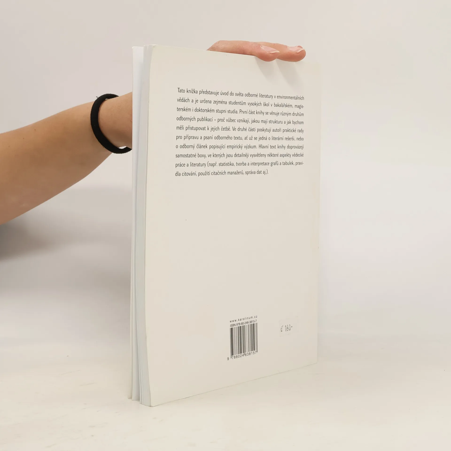 Tato knížka představuje úvod do světa odborné literatury v environmentálních vědách a je určena zejména studentům vysokých škol v bakalářském, magisterském i doktorském stupni studia. První část knihy se věnuje různým druhům odborných publikací - proč vůbec vznikají, jakou mají strukturu a jak bychom měli přistupovat k jejich četbě. Ve druhé části poskytují autoři praktické rady pro přípravu a psaní odborného textu, ať už se jedná o literární rešerši, nebo o odborný článek popisující empirický výzkum. Hlavní text knihy doprovázejí samostatné boxy, ve kterých jsou detailněji vysvětleny některé aspekty vědecké práce a literatury (např. statistika, tvorba a interpretace grafů a tabulek, pravidla citování, použití citačních manažerů, správa dat aj.).