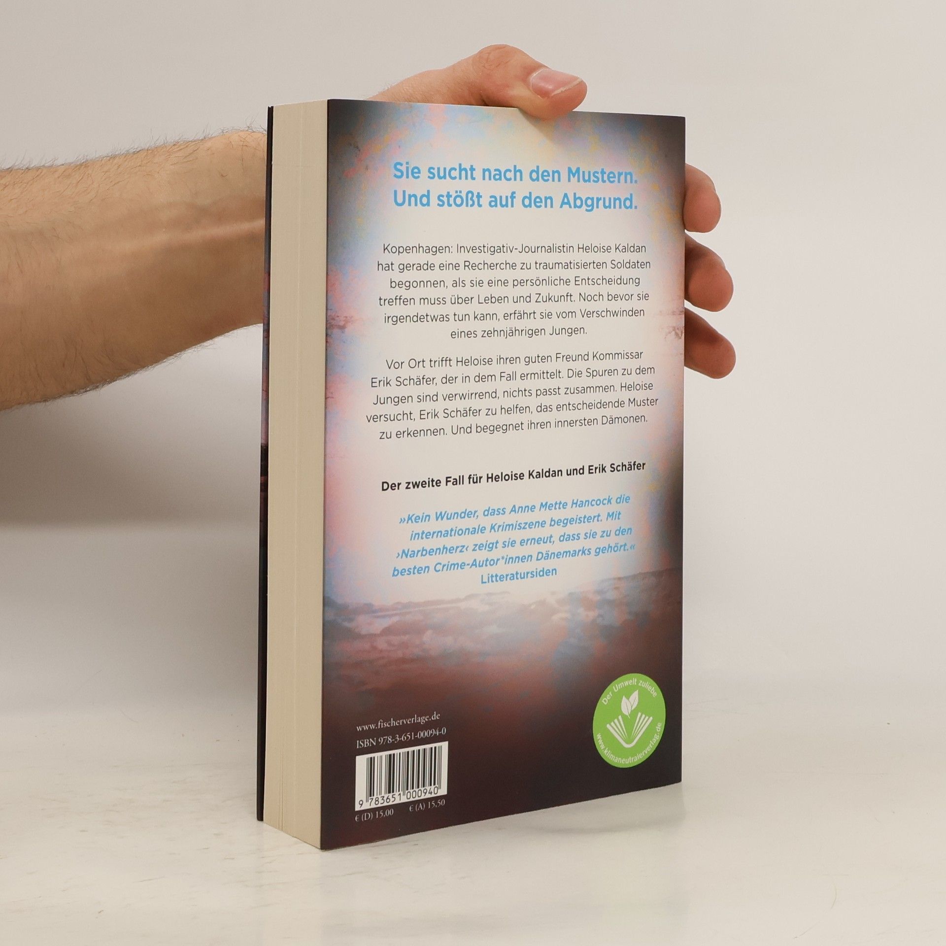 Sie sucht nach den Mustern. Und stößt auf den Abgrund. »Die beste Crime-Serie, die ich dieses Jahr gelesen habe. Fesselnd, düster und sympathisch – Kaldan und Schäfer sind mein neues Lieblings-Ermittlerduo.« Harlan Coben Kopenhagen: Investigativ-Journalistin Heloise Kaldan hat gerade eine Recherche zu traumatisierten Soldaten begonnen, als sie eine persönliche Entscheidung treffen muss über Leben und Zukunft. Noch bevor sie irgendetwas tun kann, erfährt sie vom Verschwinden eines zehnjährigen Jungen. Vor Ort trifft Heloise ihren guten Freund Kommissar Erik Schäfer, der in dem Fall ermittelt. Die Spuren zu dem Jungen sind verwirrend, nichts passt zusammen. Heloise versucht, Erik Schäfer zu helfen, das entscheidende Muster zu erkennen. Und begegnet ihren innersten Dämonen. »Kein Wunder, dass Anne Mette Hancock die internationale Krimiszene begeistert. Mit ›Narbenherz‹ zeigt sie erneut, dass sie zu den besten Crime-Autor*innen Skandinaviens gehört.« Litteratursiden Der zweite Fall für Heloise Kaldan und Erik Schäfer.