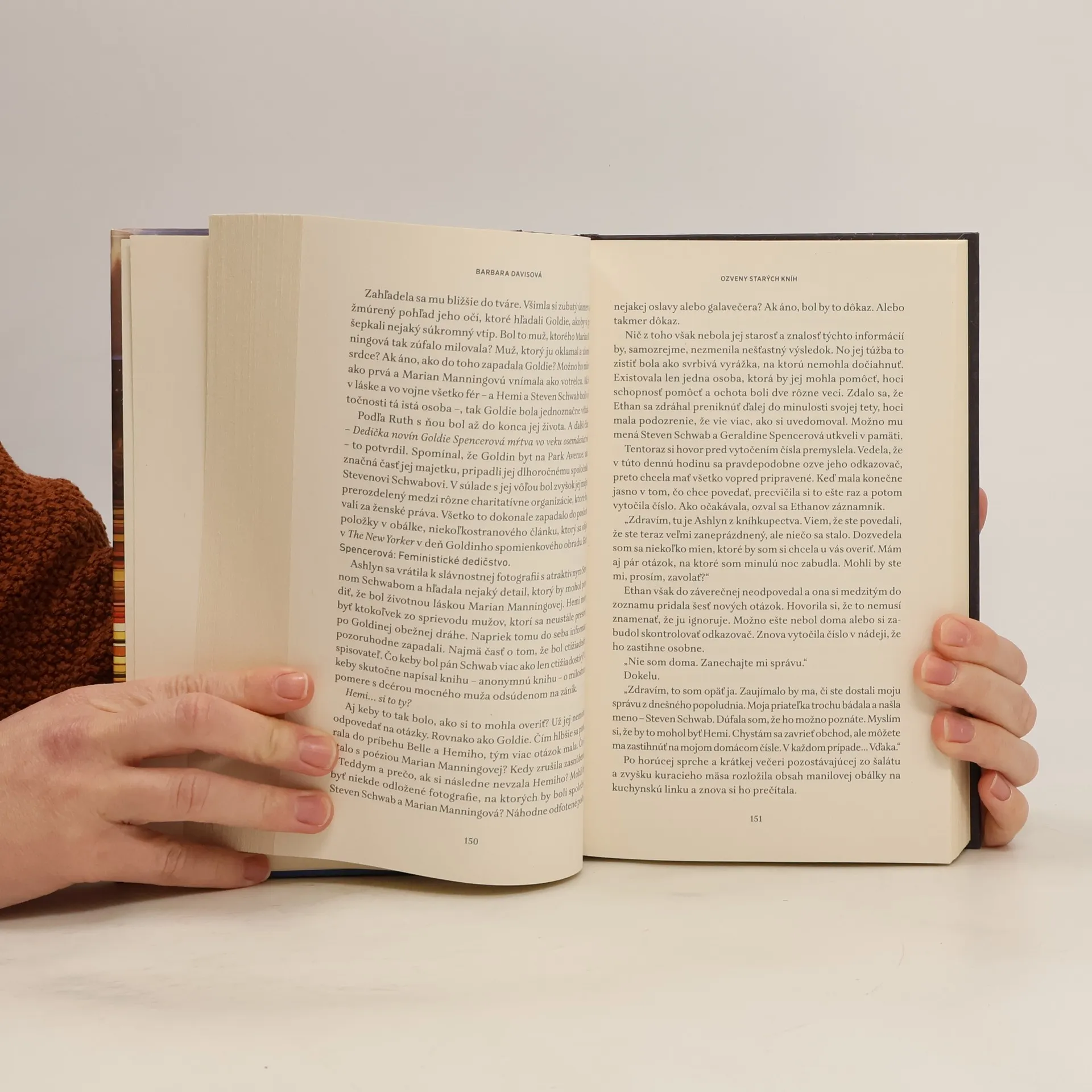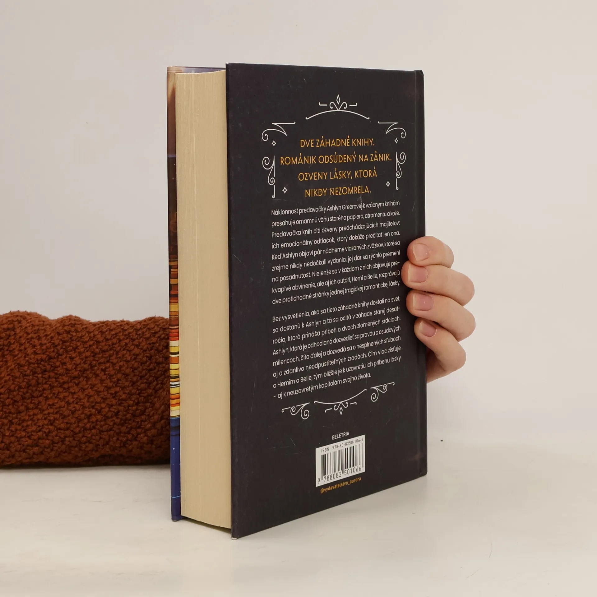 Doposiaľ najúspešnejší román od Barbary Davisovej, autorky známych bestsellerov Strážkyňa šťastných koncov a Posledná žena z rodu Moonovcov, je o magickom vábení kníh a o odvahe prepísať svoje vlastné príbehy. Svojím originálnym spracovaním, pútavou tematikou a silnými postavami oslovil veľké množstvo čitateľov, o čom svedčí aj jeho nominácia na cenu Goodreads Choice za najlepší historický román v roku 2023. Táto uznaná nominácia zvýrazňuje jeho príťažlivosť a cieli na čitateľov, ktorí túžia po romantickom dobrodružstve a záhadách spätých s magickým svetom kníh. Náklonnosť predavačky Ashlyn Greerovej k vzácnym knihám presahuje omamnú vôňu starého papiera, atramentu a kože. Predavačka kníh cíti ozveny predchádzajúcich majiteľov: ich emocionálny odtlačok, ktorý dokáže prečítať len ona. Keď Ashlyn objaví pár nádherne viazaných zväzkov, ktoré sa zrejme nikdy nedočkali vydania, jej dar sa rýchlo premení na posadnutosť. Nielenže sa v každom z nich objavuje prekvapivé obvinenie, ale aj ich autori, Hemi a Belle, rozprávajú dve protichodné stránky jednej tragickej romantickej lásky. Bez vysvetlenia, ako sa tieto záhadné knihy dostali na svet, sa dostanú k Ashlyn a tá sa ocitá v záhade starej desaťročia, ktorá prináša príbeh o dvoch zlomených srdciach. Ashlyn, ktorá je odhodlaná dozvedieť sa pravdu o osudových milencoch, číta ďalej a dozvedá sa o nesplnených sľuboch aj o zdanlivo neodpustiteľných zradách. Čím viac zisťuje o Hemim a Belle, tým bližšie je k uzavretiu ich príbehu lásky – aj k neuzavretým kapitolám svojho života.