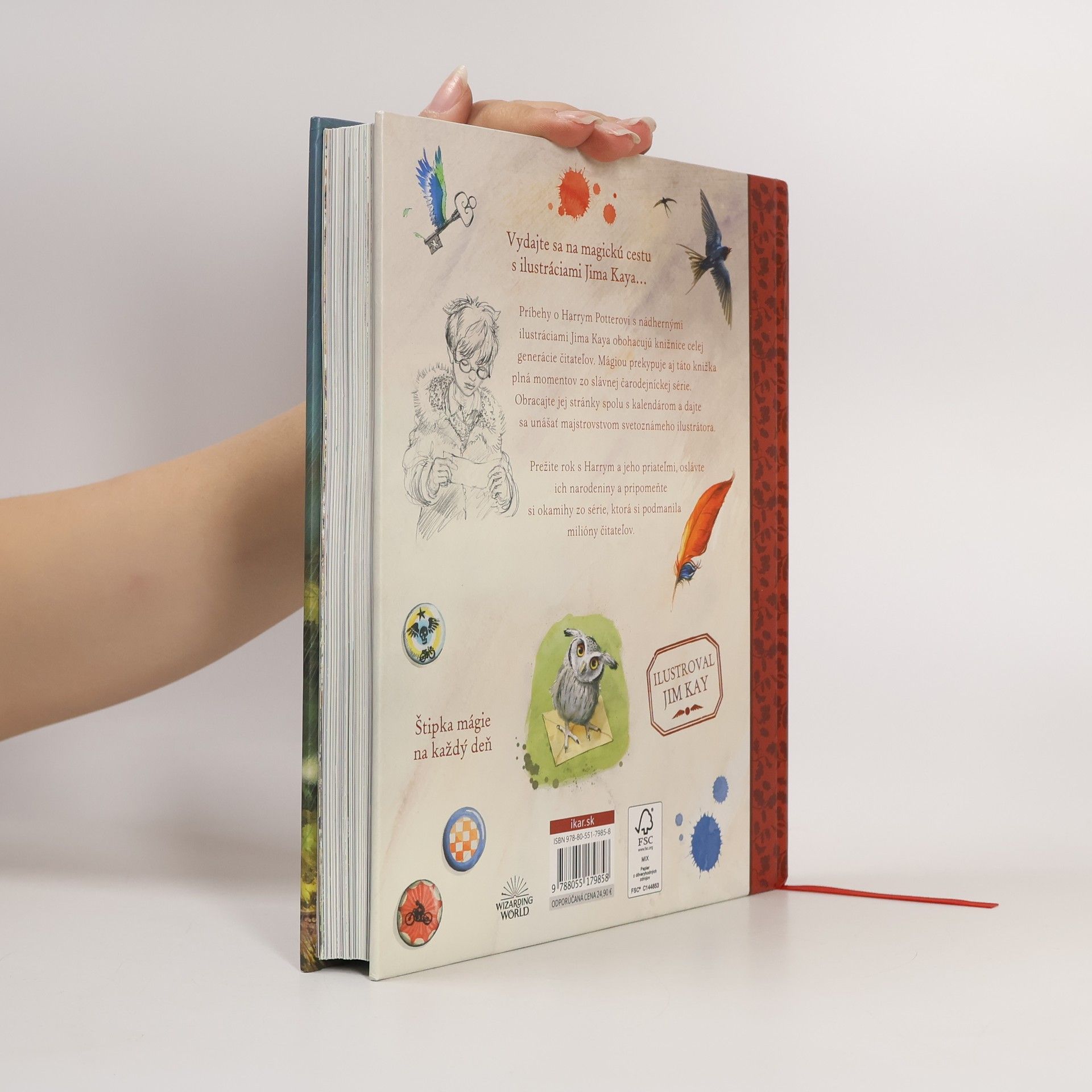 Štipka mágie na každý deň! Vydajte sa na magickú cestu s ilustráciami Jima Kaya a pripomeňte si všetky kúzla, krásu a zázraky čarodejníckeho sveta J.K. Rowlingovej. Príbehy o Harrym Potterovi s nádhernými ilustráciami Jima Kaya obohacujú knižnice celej generácie čitateľov. Mágiou prekypuje aj táto knižka plná momentov zo slávnej čarodejníckej série. Obracajte jej stránky spolu s kalendárom a dajte sa unášať majstrovstvom svetoznámeho ilustrátora. V tejto darčekovej knižke nájdete citát či ukážku zo série o mladom čarodejníkovi na každý deň v roku a zistíte, kedy môžete osláviť narodeniny Rona Weasleyho či profesora Lupina. K výberu Kayových najznámejších ilustrácií pribudli doteraz nezverejnené náčrty a prípravné skice. Zasnežené rokfortské vežičky, milé oči profesora Dumbledora za sklíčkami okuliarov v tvare polmesiacov aj zhon Šikmej uličky. Prežite rok s Harrym a jeho priateľmi, oslávte ich narodeniny a pripomeňte si momenty, ktoré ste s nimi prežívali pri čítaní čarodejníckej série, ktorá si podmanila celý svet.