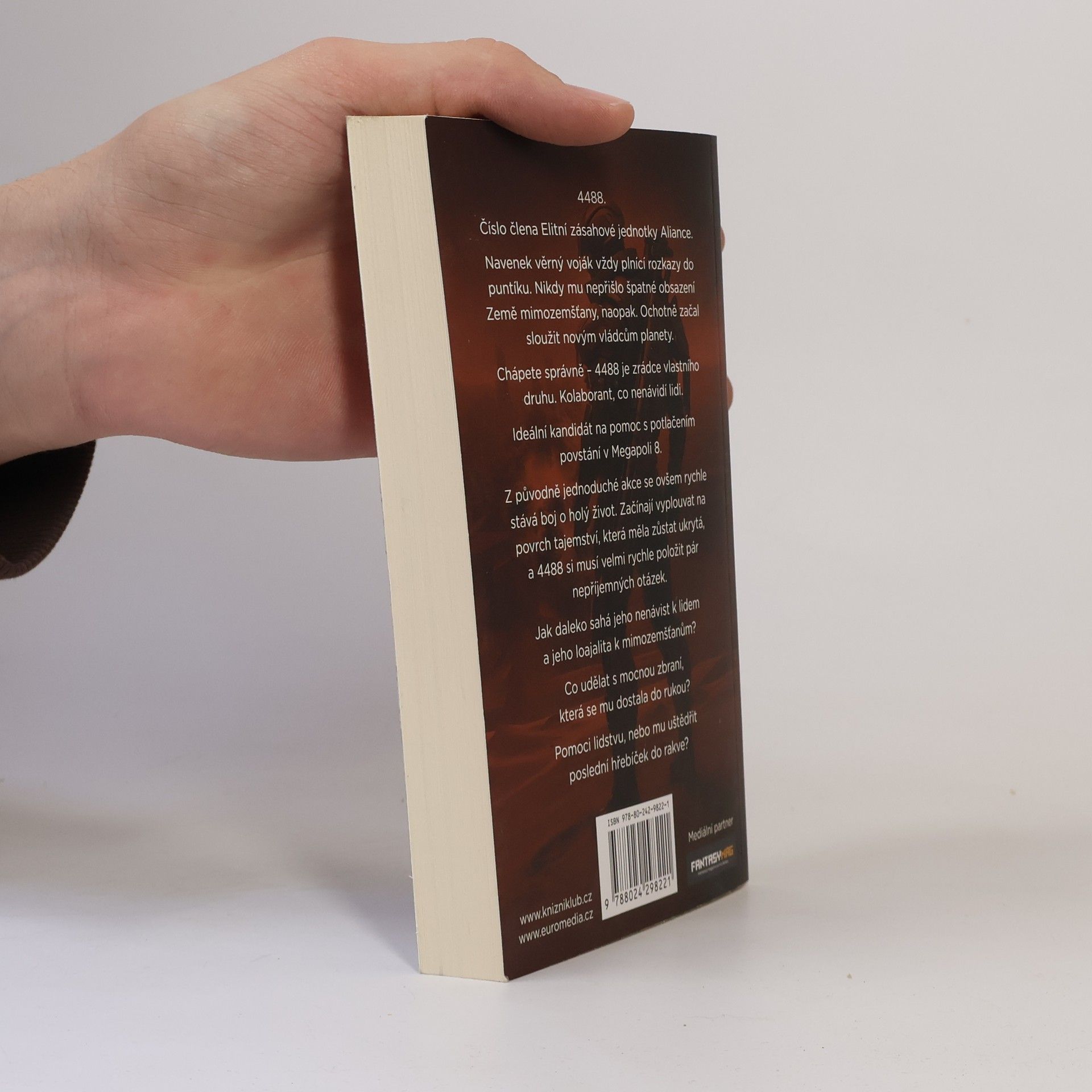 Akční military sci-fi román o invazi mimozemšťanů na Zemi. 4488. Číslo člena Elitní Zásahové jednotky Aliance. Navenek věrný voják vždy plnící rozkazy do puntíku. Neptá se, pouze plní. Nikdy mu nepřišlo špatné obsazení Země mimozemšťany, naopak. Ochotně začal sloužit novým vládcům planety. Chápete správně - 4488 je zrádce vlastního druhu. Kolaborant, co nenávidí lidi. Ideální kandidát na pomoc s potlačením povstání v Megapoli 8. Z původně jednoduché akce se rychle stává boj o holý život. Začínají vyplouvat na povrch tajemství, která měla zůstat ukrytá, a 4488 si musí velmi rychle položit pár nepříjemných otázek. Jak daleko sahá jeho nenávist k lidem a jeho loajalita k mimozemšťanům? Jsou mimozemšťané opravdoví vládci Země? Co udělat s mocnou zbraní, která se mu dostala do rukou? Pomoci lidstvu, nebo mu uštědřit poslední hřebíček do rakve? Nakladatelská anotace.