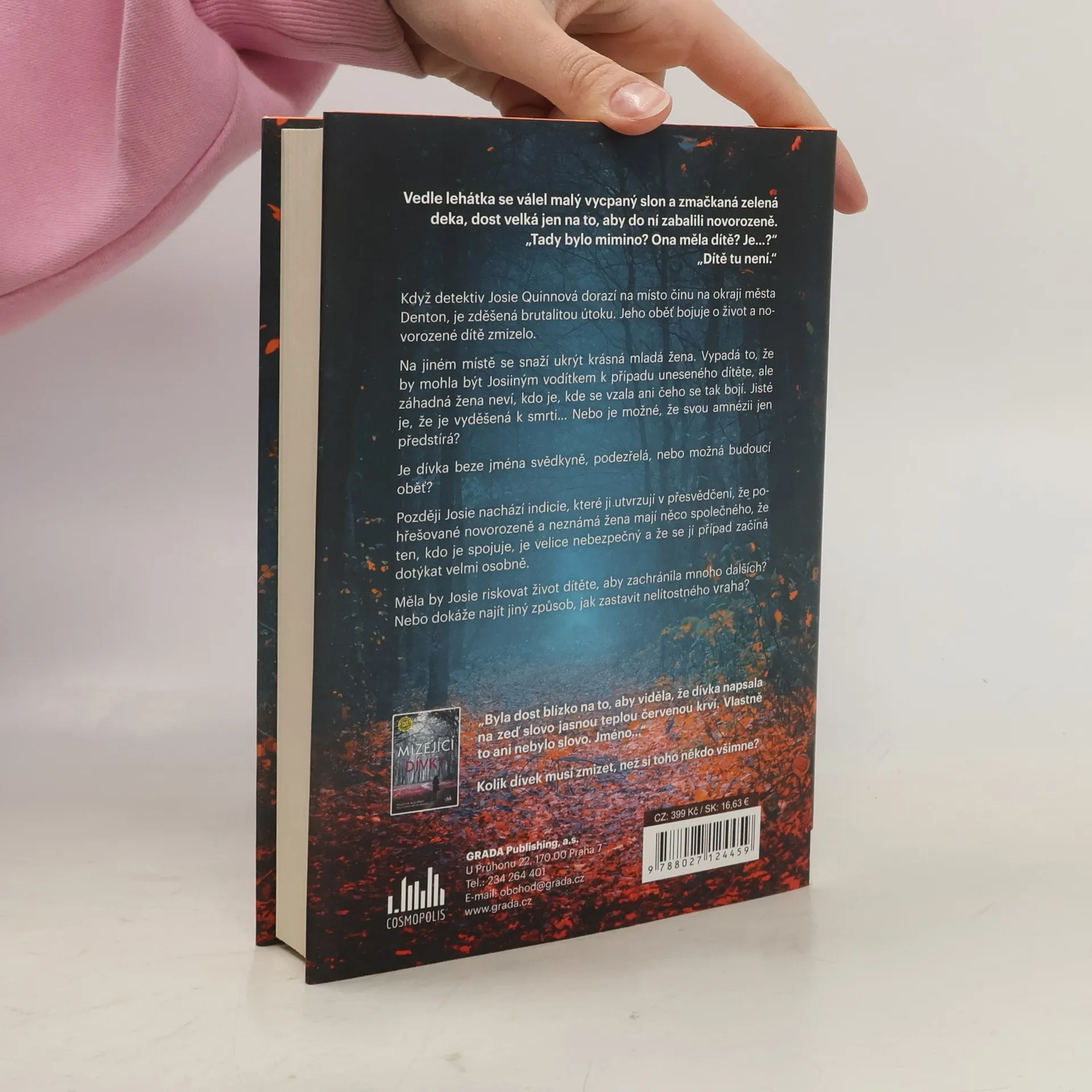 Vedle lehátka se válel malý vycpaný slon a zmačkaná zelená deka, dost velká jen na to, aby do ní zabalili novorozeně. „Tady bylo mimino? Ona měla dítě? Je…?“ „Dítě tu není.“ Když detektiv Josie Quinnová dorazí na místo činu na okraji města Denton, je zděšená brutalitou útoku. Jeho oběť bojuje o život a novorozené dítě zmizelo. Na jiném místě se snaží ukrýt krásná mladá žena. Vypadá to, že by mohla být Josiiným vodítkem k případu uneseného dítěte, ale záhadná žena neví, kdo je, kde se vzala ani čeho se tak bojí. Jisté je, že je vyděšená k smrti… Nebo je možné, že svou amnézii jen předstírá? Je dívka beze jména svědkyně, podezřelá, nebo možná budoucí oběť? Později Josie nachází indicie, které ji utvrzují v přesvědčení, že pohřešované novorozeně a neznámá žena mají něco společného, že ten, kdo je spojuje, je velice nebezpečný a že se jí případ začíná dotýkat velmi osobně. Měla by Josie riskovat život dítěte, aby zachránila mnoho dalších? Nebo dokáže najít jiný způsob, jak zastavit nelítostného vraha?